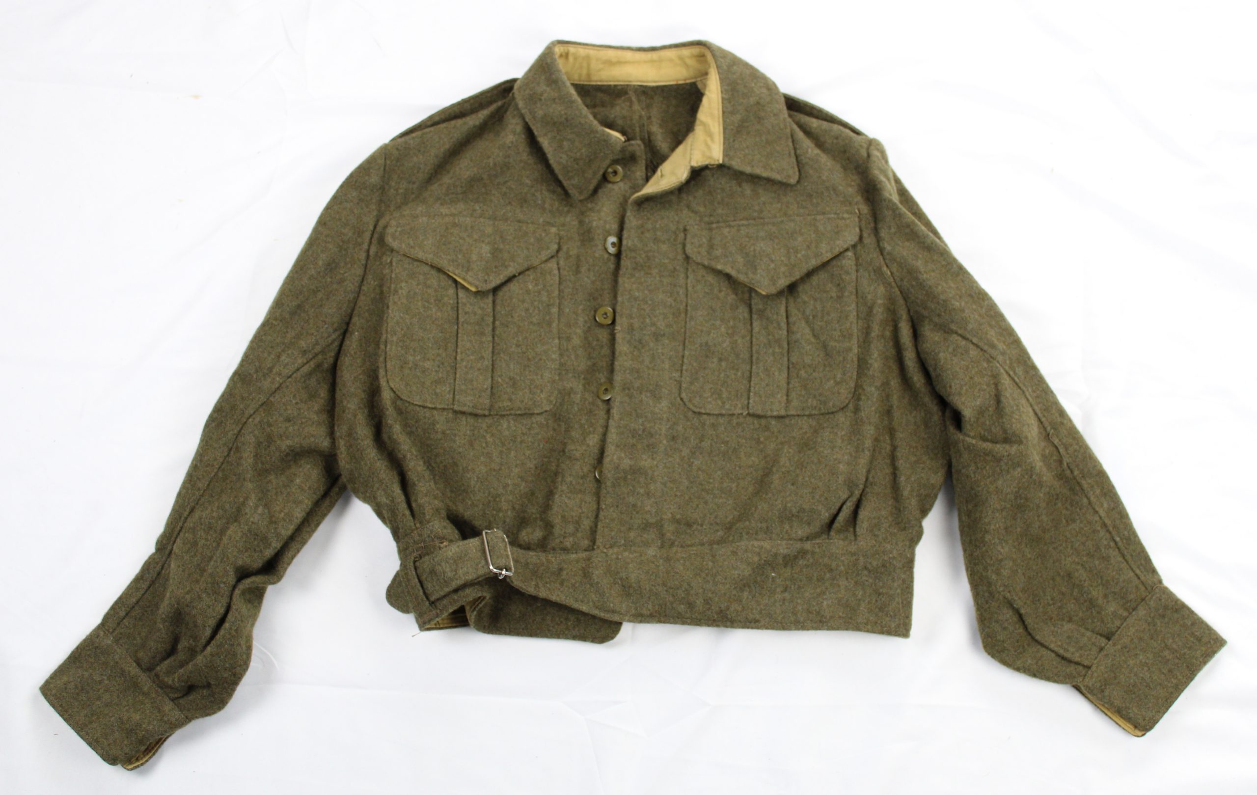 Olive drab wool battle dress blouse featuring a short, fitted waist design with an integrated belt and metal buckle. The front has five green plastic buttons and two pleated chest pockets with buttoned flaps. The collar is lined with khaki cotton material, showing a slightly lighter tone than the rest of the garment. The cuffs close with adjustable button tabs.