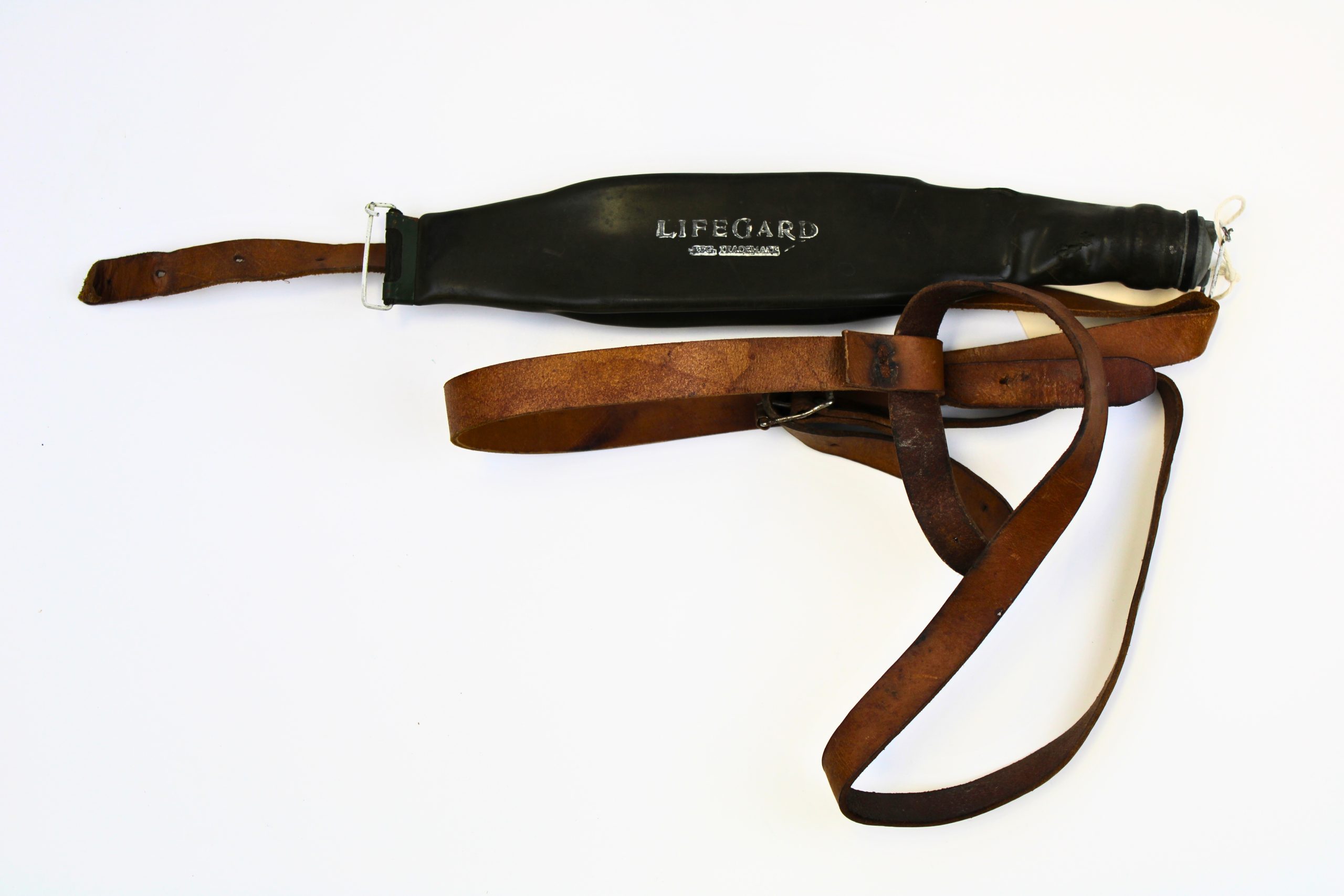 A personal flotation device consisting of a black rubber air bladder with a brown leather harness and buckle straps. The front of the rubber bladder bears the embossed text “LIFEGARD RED RIDING HOOD.” A small metal buckle and tie string are attached for securing the bladder, while adjustable leather straps were designed to fasten around the wearer’s torso.