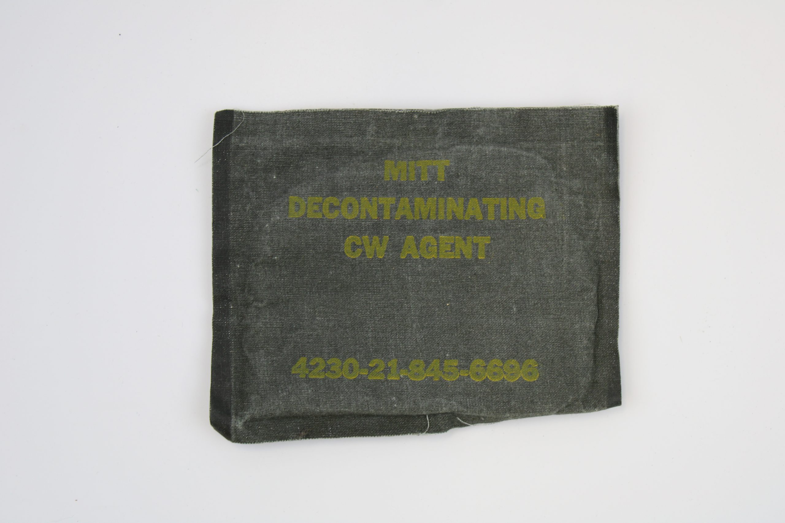 Such mitts were part of standard issue NBC (Nuclear, Biological, Chemical) defense kits and were intended for one-time emergency use. Soldiers would wipe contaminated surfaces to neutralize or remove harmful agents after exposure in chemical warfare scenarios.