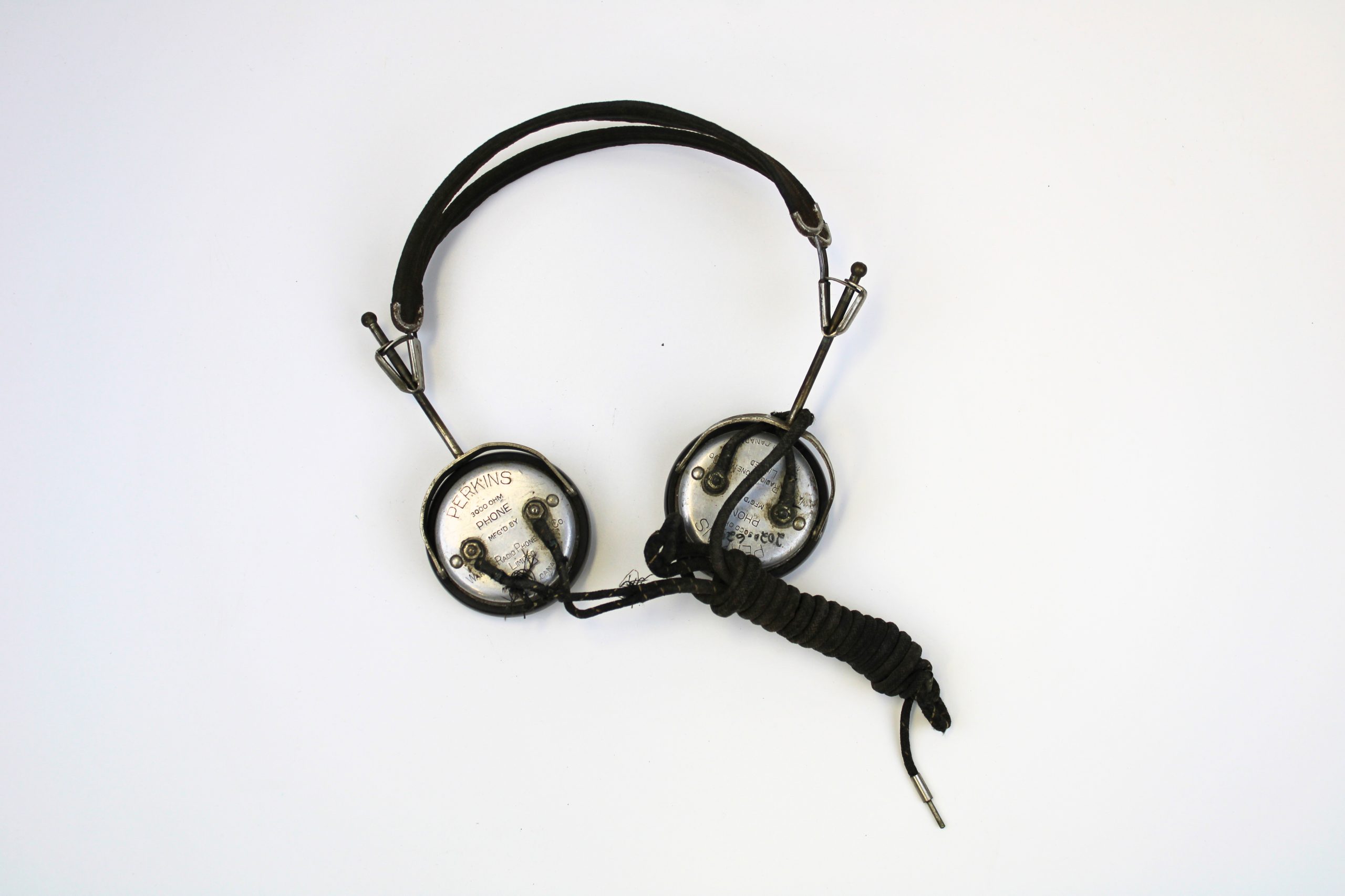 Pair of early metal and bakelite headphones with black cloth-covered headband and connecting wire. The earpieces are round with silver metal caps, each engraved “PERKINS 2000 OHMS PHONE, No. 15A, Made in Canada, Perkins Electric Co. Ltd. Toronto.” The insulated black cord connects both earpieces, ending in a single plug.