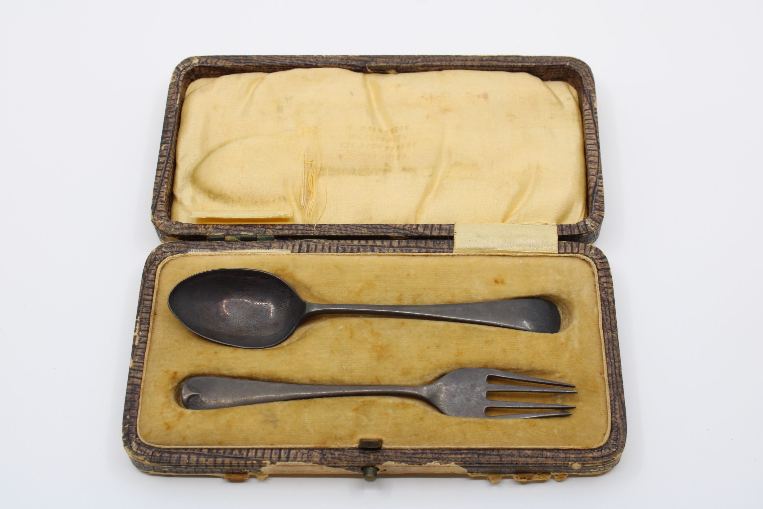 A matched fork and spoon set presented in its original fitted case. The utensils are made of darkened silver or silver-plated metal, exhibiting patina consistent with age. Both have a plain, slightly rounded handle design, typical of late 19th to early 20th-century English flatware.