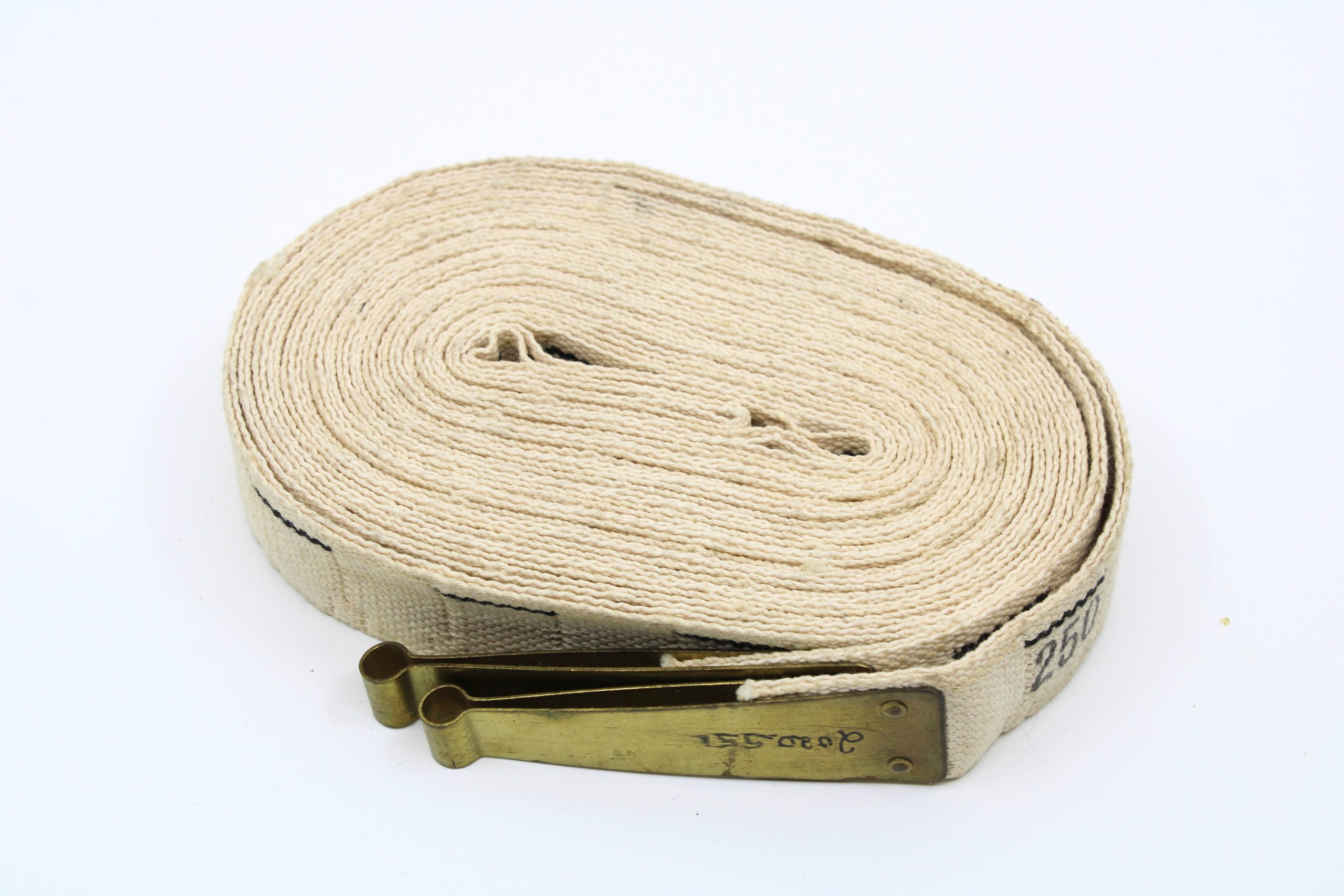 A woven cotton webbing belt or strap, beige in colour, with a brass slide buckle at one end. The strap is tightly rolled. Printed in black ink along the fabric are patent and manufacturing markings. The webbing is robust, consistent with U.S. military-issue web gear used during the Second World War.