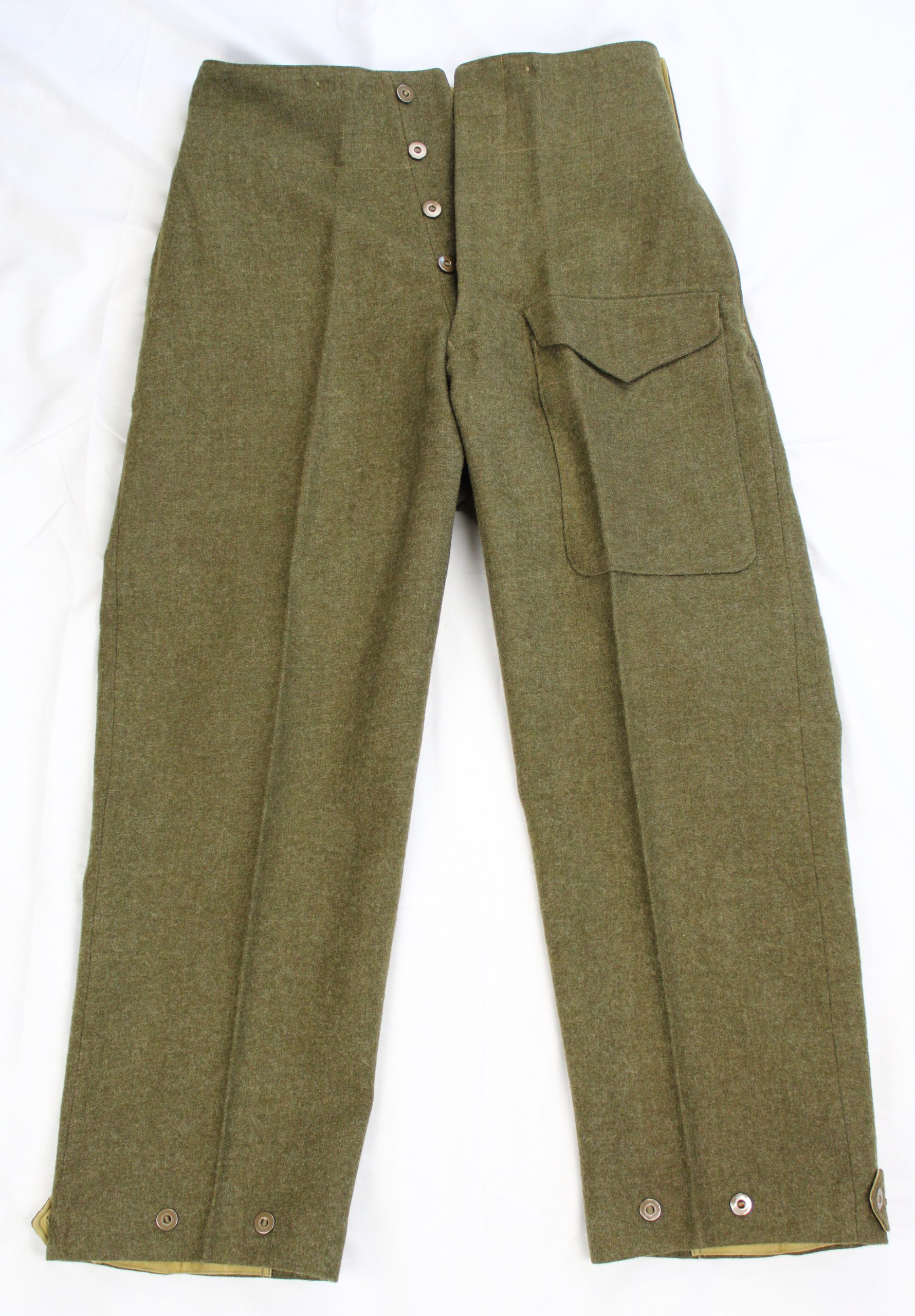 These trousers were standard issue for Canadian and British Army personnel during the Second World War and early post-war period, matching the battle dress blouse 2020.509.001.
