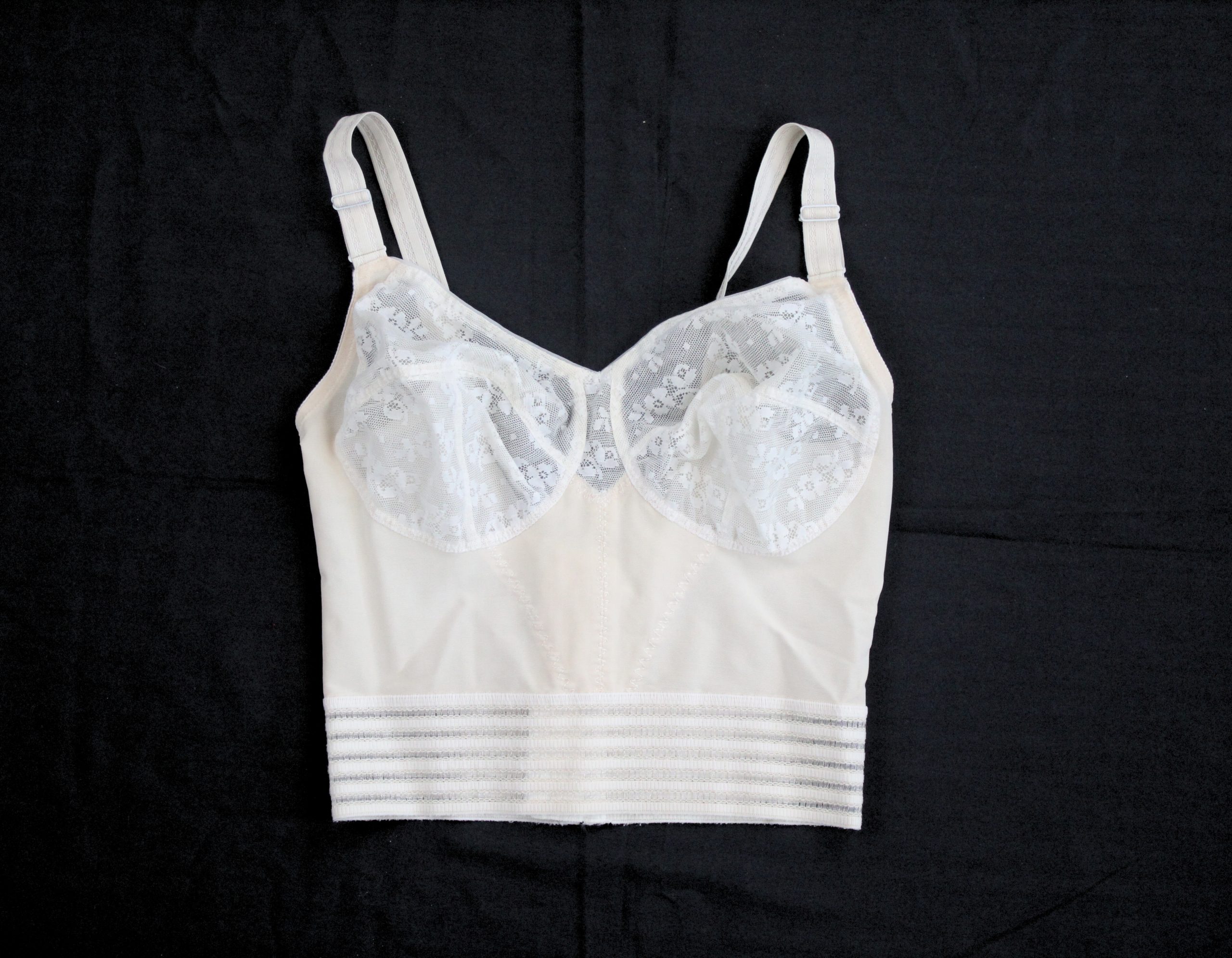 Off-white longline brassiere with lightly structured cups made of nylon lace featuring a floral pattern. The cups are sheer and unlined, joined by a central seam for shaping. The lower band measures approximately 2½ inches and is made of alternating horizontal stripes of elastic and lace. Adjustable shoulder straps are made of satin-finish elastic with metal sliders. Closure at the back by hook-and-eye fasteners.