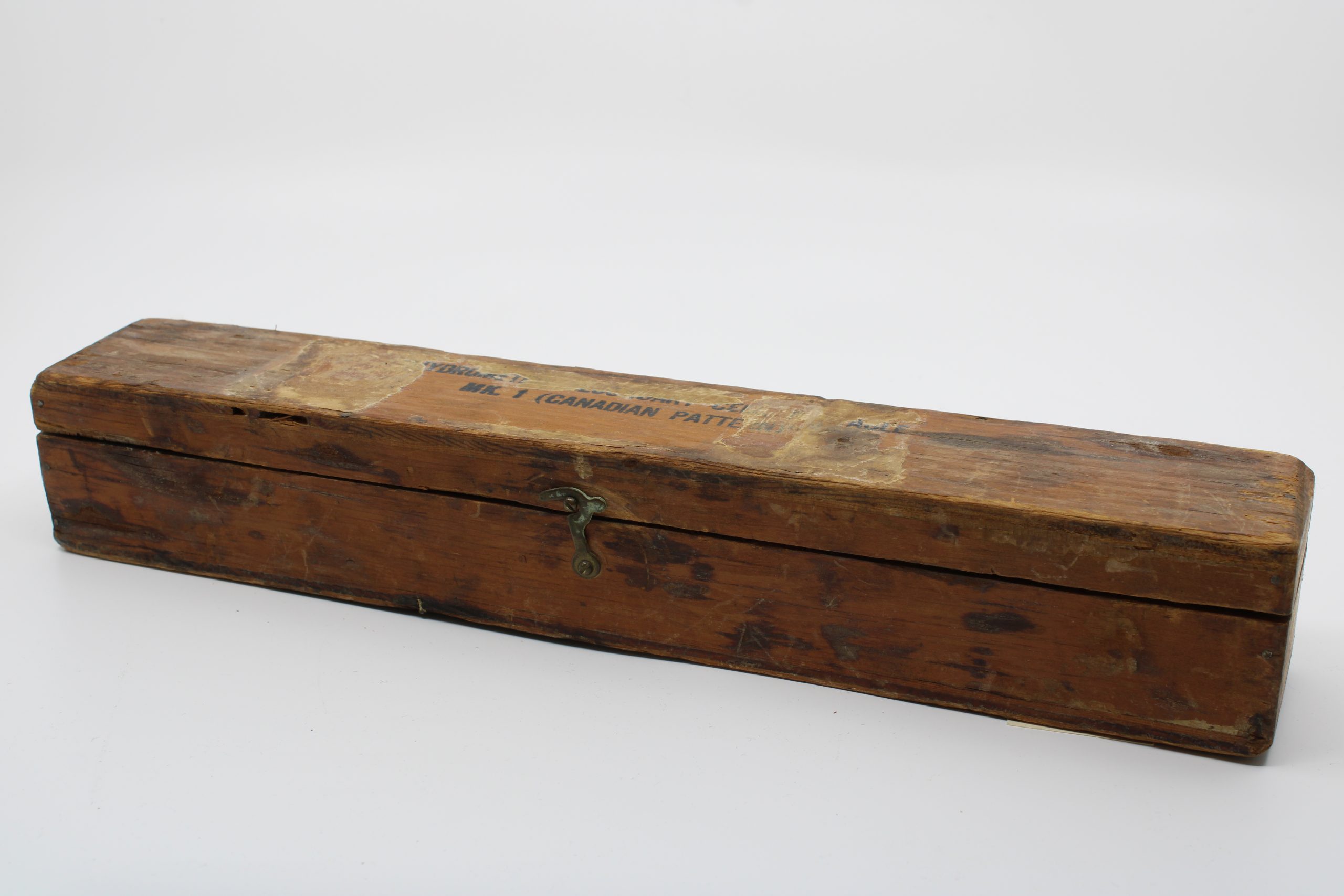 Rectangular wooden case designed to contain a battery hydrometer set manufactured by Exide Batteries. The box is long and narrow, constructed of joined wooden planks with a sliding brass latch closure on the front and simple metal hinges at the back. Traces of original paper labeling and black stenciled lettering are visible on the lid, indicating its Canadian manufacture and model number.