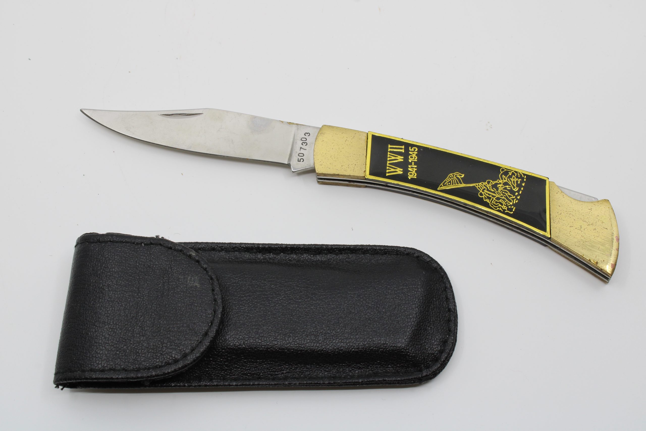 Commemorative folding pocket knife featuring a polished stainless-steel blade and a gold-and-black handle with an engraved design. The handle bears the inscription “WWII 1941–1945” alongside an image of soldiers raising a flag, inspired by the iconic Iwo Jima memorial motif. The knife is accompanied by a black faux-leather carrying case with a flap closure.