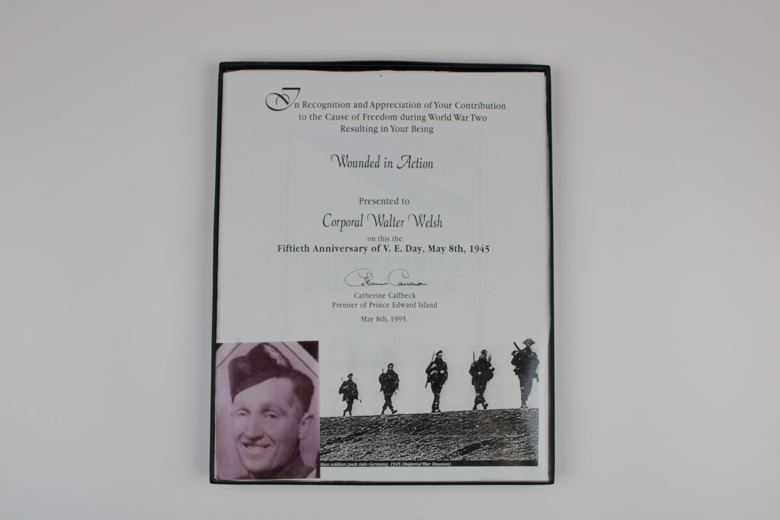 Framed certificate presented to Corporal Walter Welsh in recognition of his contribution to the cause of freedom during the Second World War, noting t