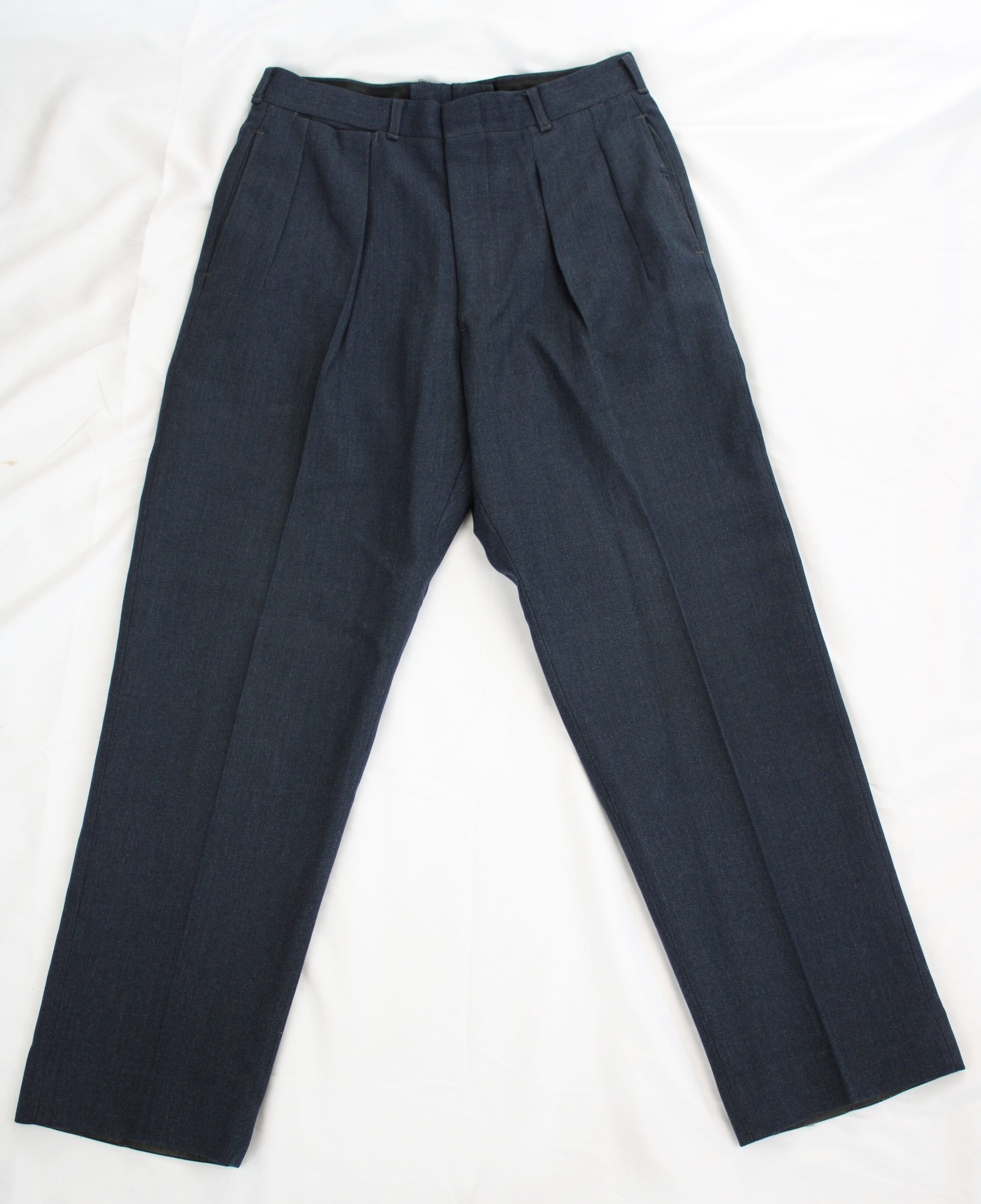 Pair of navy blue wool-blend dress trousers tailored for Flying Officer (F/O) Cooper, as indicated on the interior maker’s label. The trousers featu