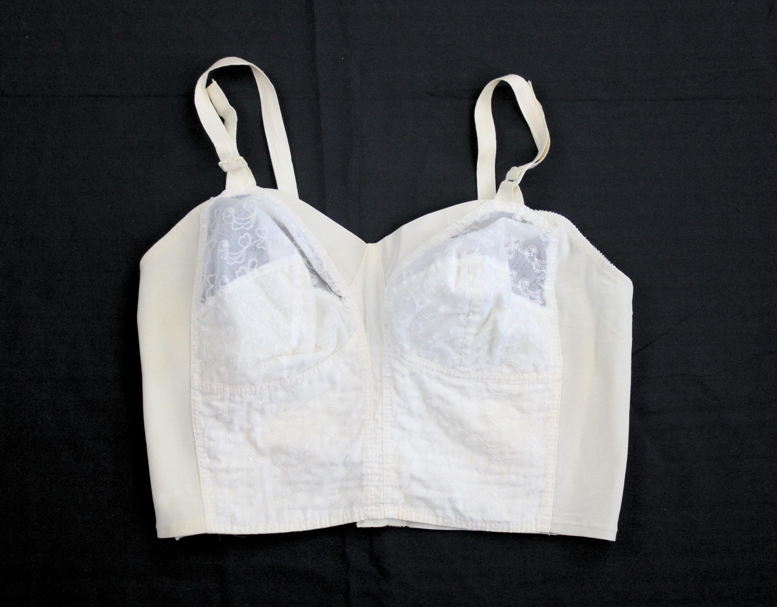 Off-white longline brassiere featuring lace cups and bodice with a heart-shaped floral motif. The design includes full-coverage cups and a moderately