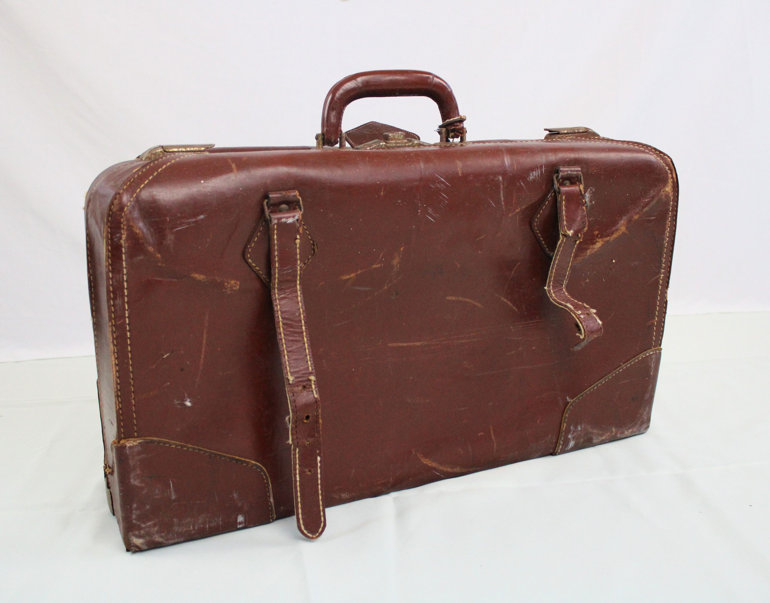A rectangular suitcase covered in brown leather with beige woven fabric panels. The case has a leather handle, metal clasps, and tan stitching along t