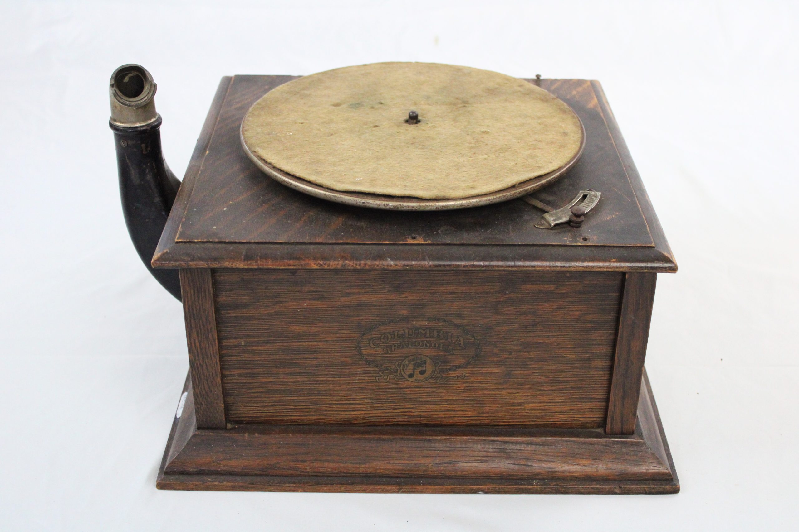 A tabletop Columbia Grafonola phonograph, featuring a rectangular oak case with a hinged lid.