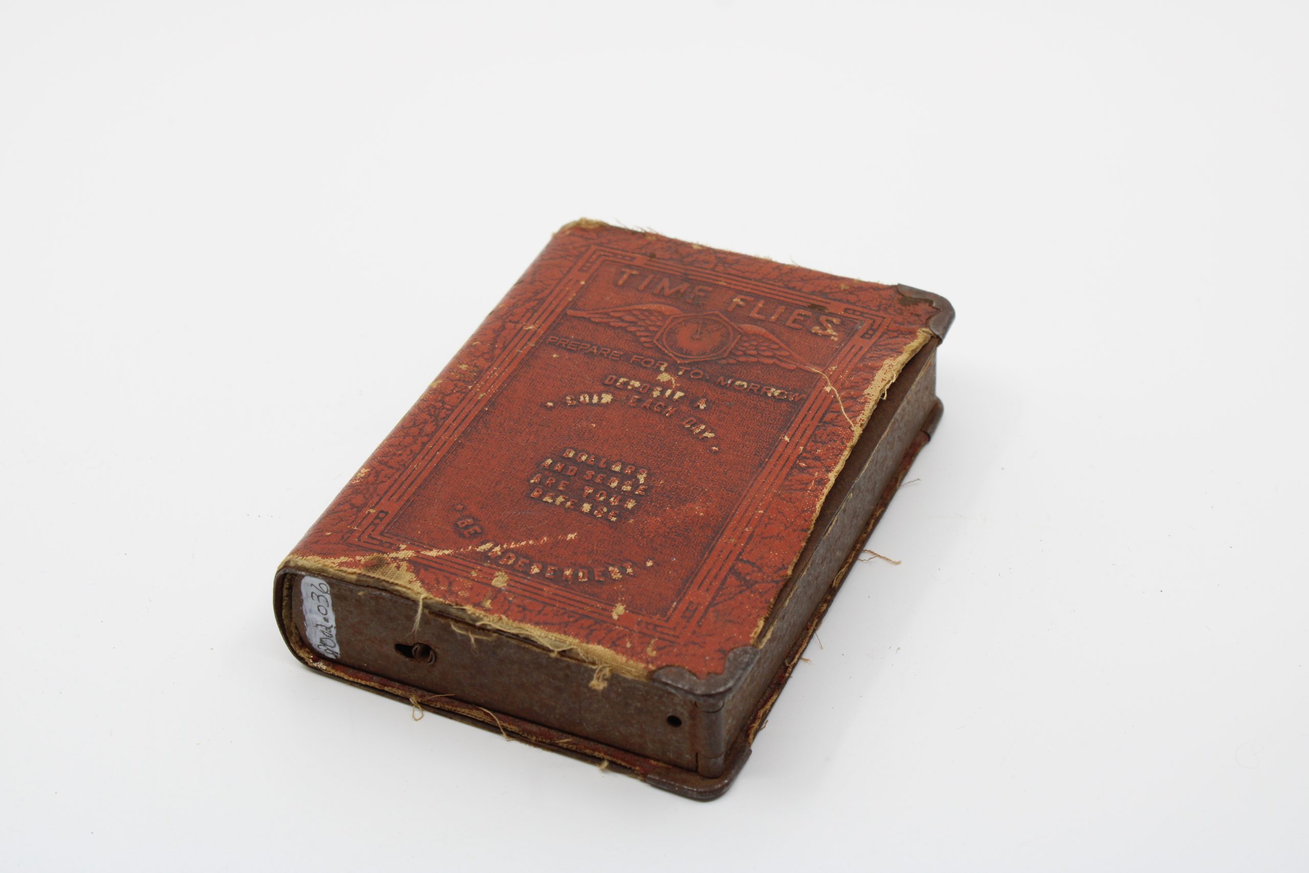 Small rectangular metal coin bank designed to resemble a book, with a worn red cover printed with embossed text that reads: