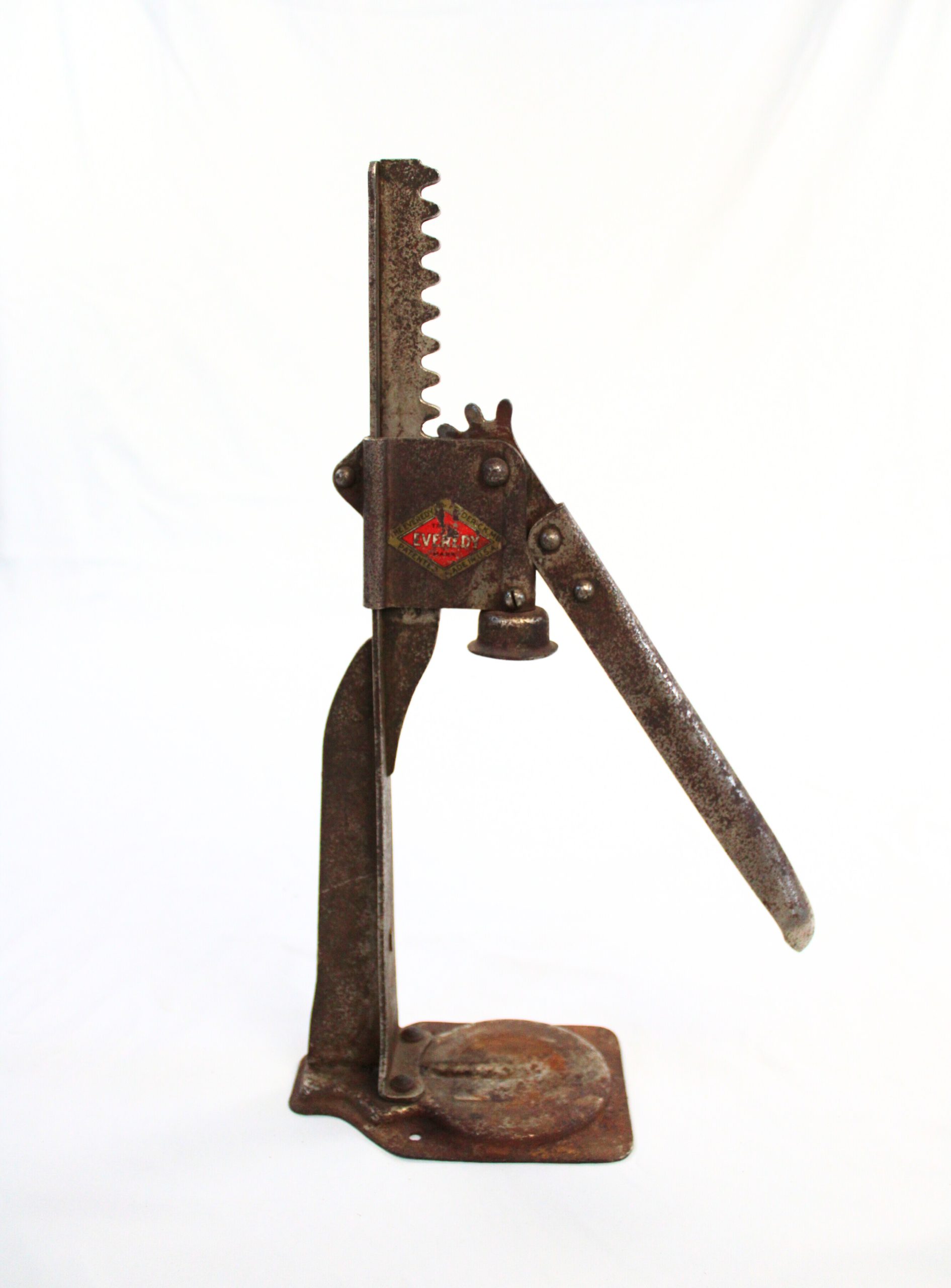 A cast-iron bottle capper with a tall vertical post, gear mechanism, and lever arm for applying pressure to seal bottles with metal caps. The machine