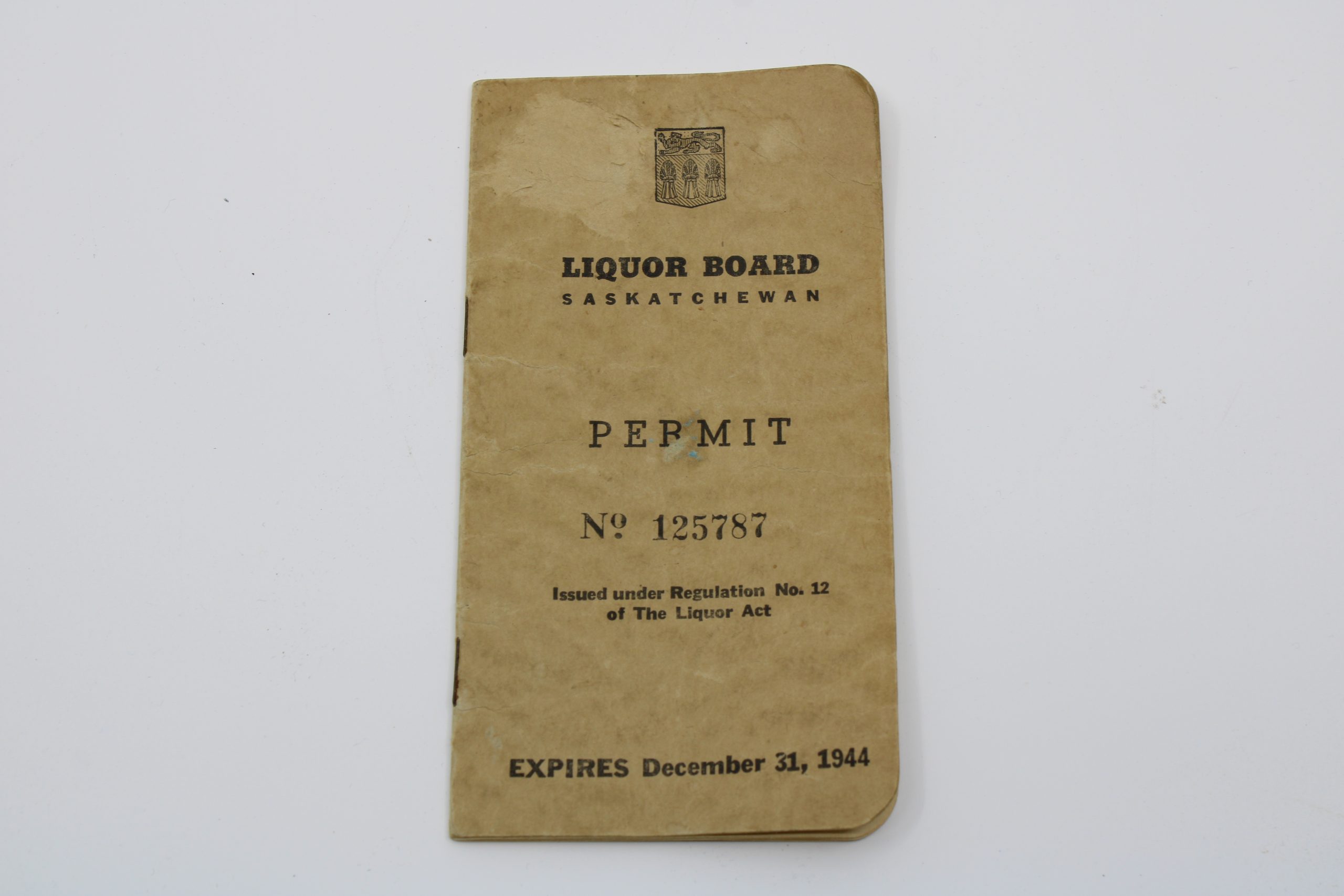 Rectangular brown paper permit booklet used for purchasing alcohol in Saskatchewan during the mid-1940s.