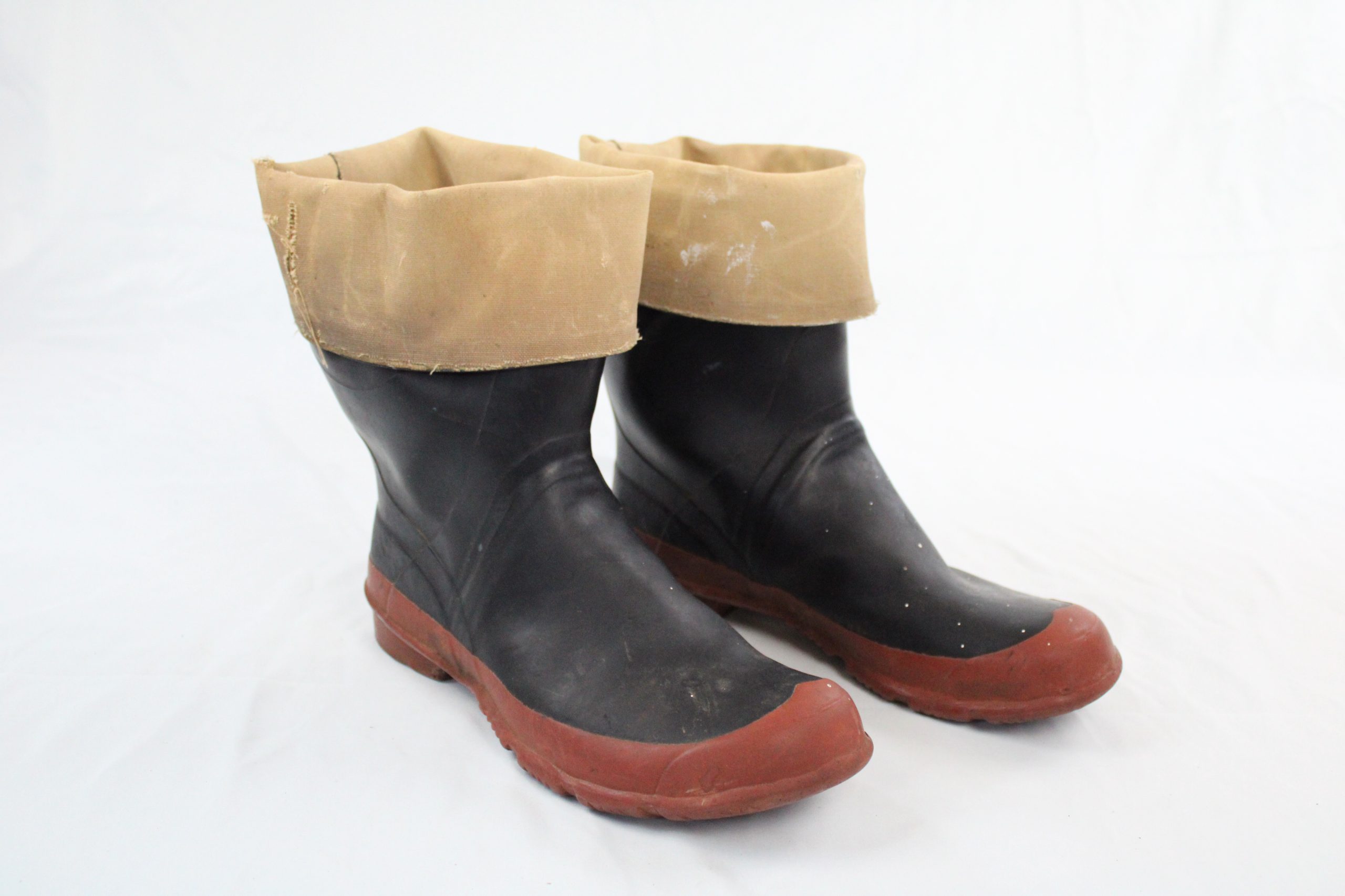 A pair of black rubber fishing boots with rust-coloured soles, toes, and heels, and beige canvas cuffs at the top.