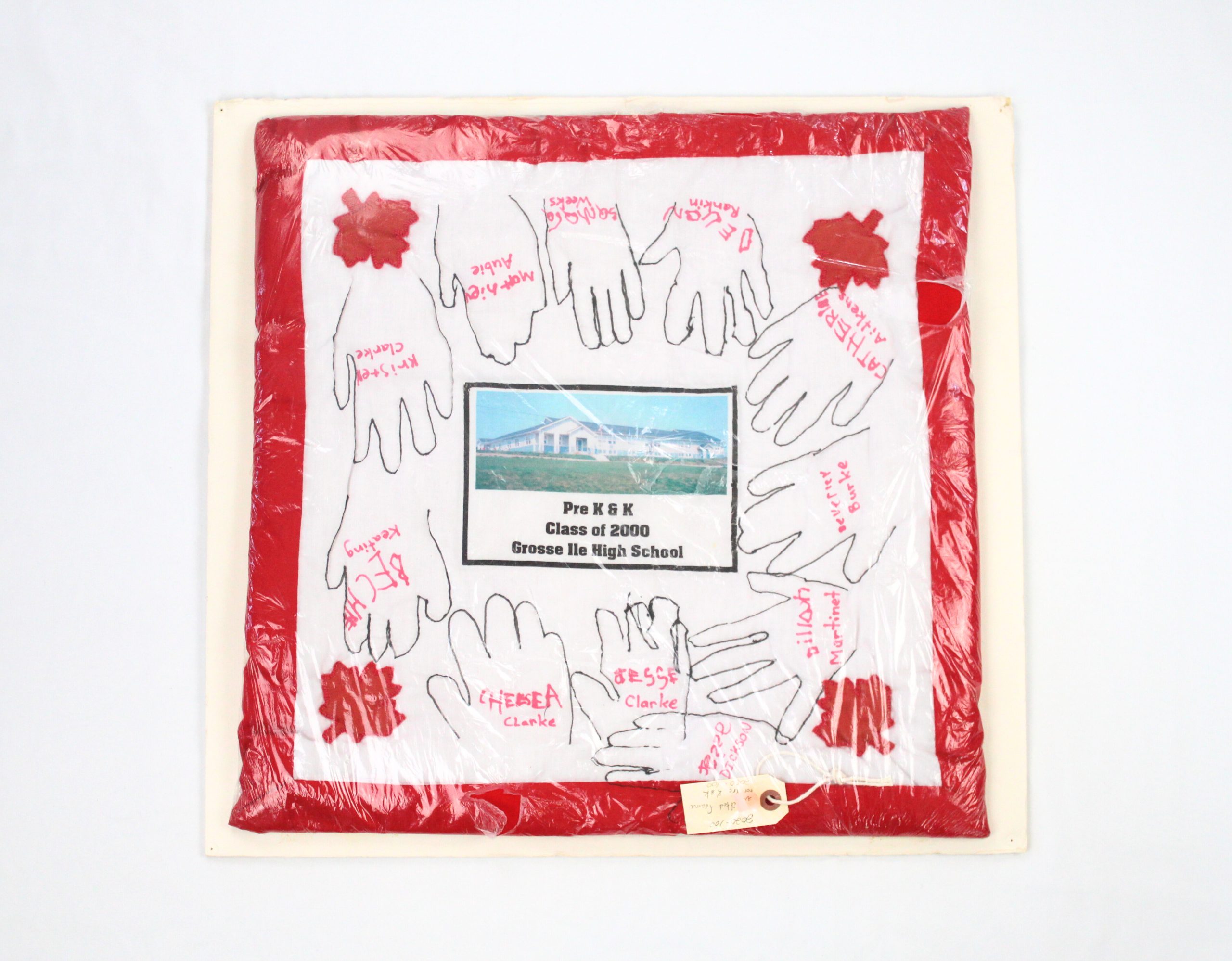 A handmade commemorative quilt created by the Pre-K and Kindergarten Class of 2000 at Grosse Ile High School.