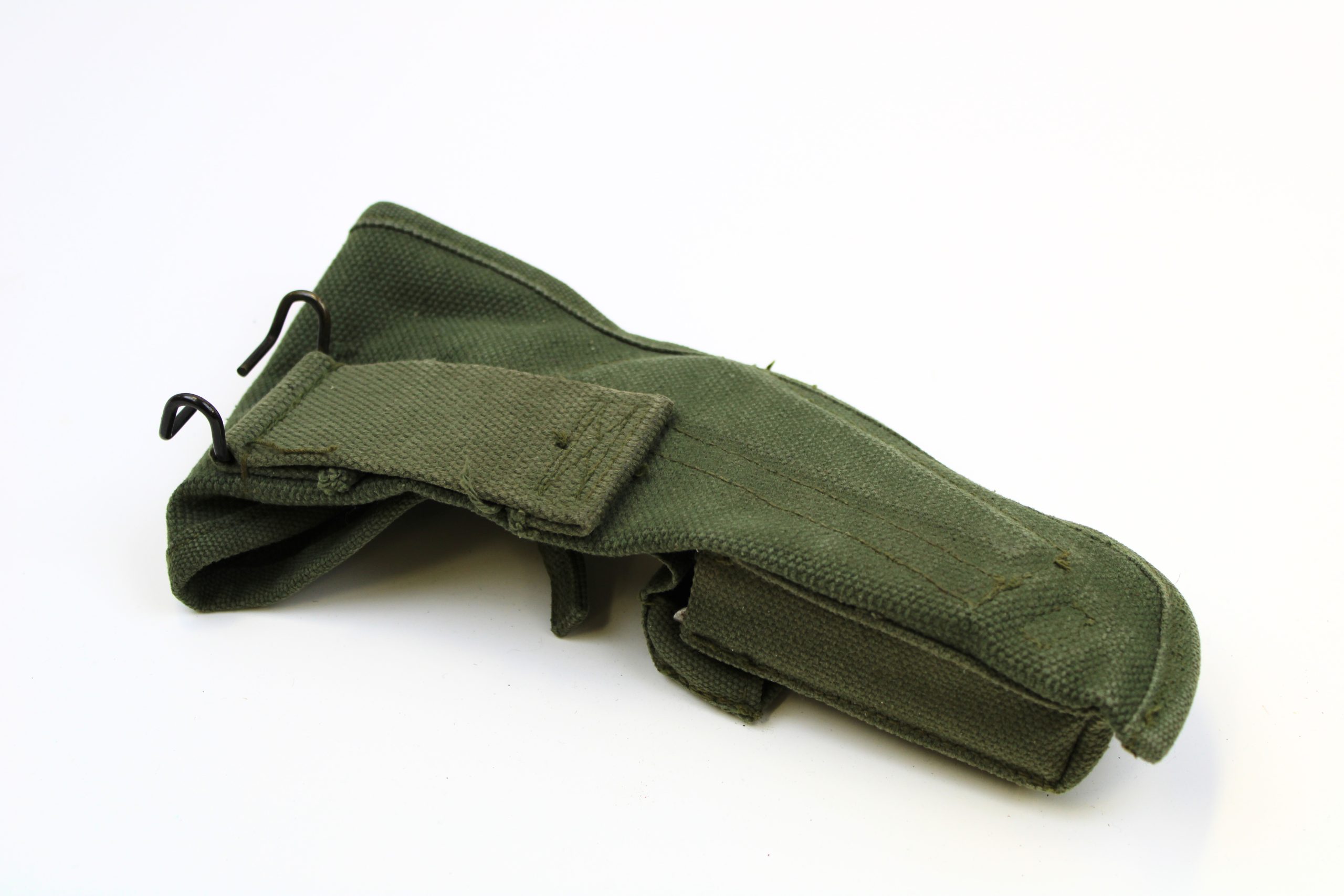 Olive-green canvas pistol holster with reinforced stitching and two blackened metal belt hooks for attachment to web equipment. The holster features a