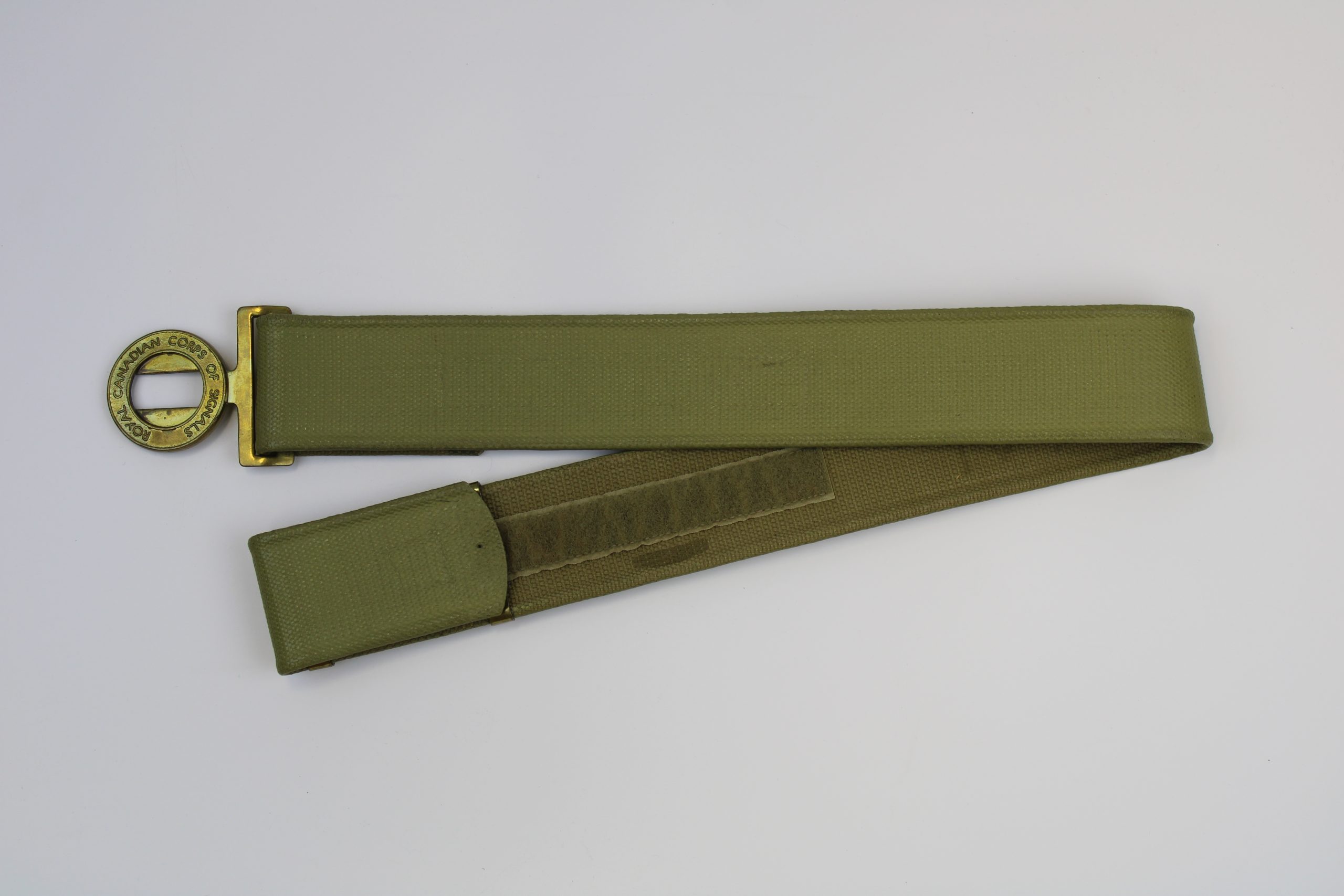 A green woven web belt featuring a brass circular buckle embossed with the inscription “ROYAL CANADIAN CORPS OF SIGNALS” around an open rectangula