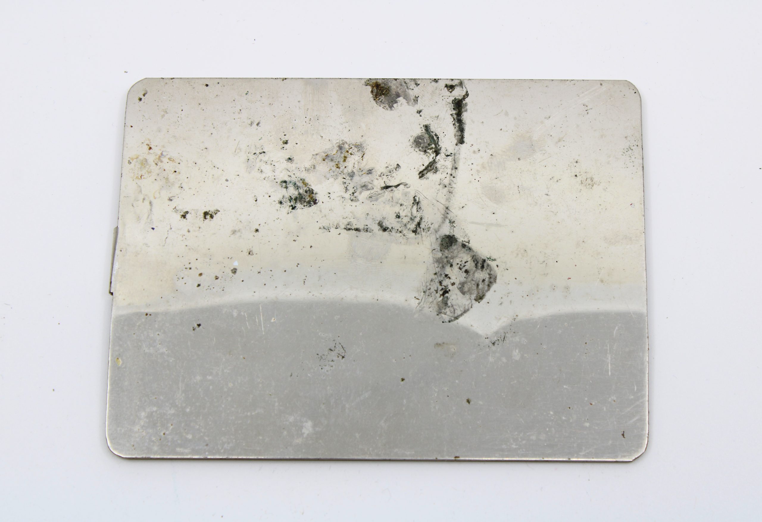 Rectangular metal shaving mirror with folding wire stand attached to the back. The mirror’s reflective surface is made of polished metal rather than