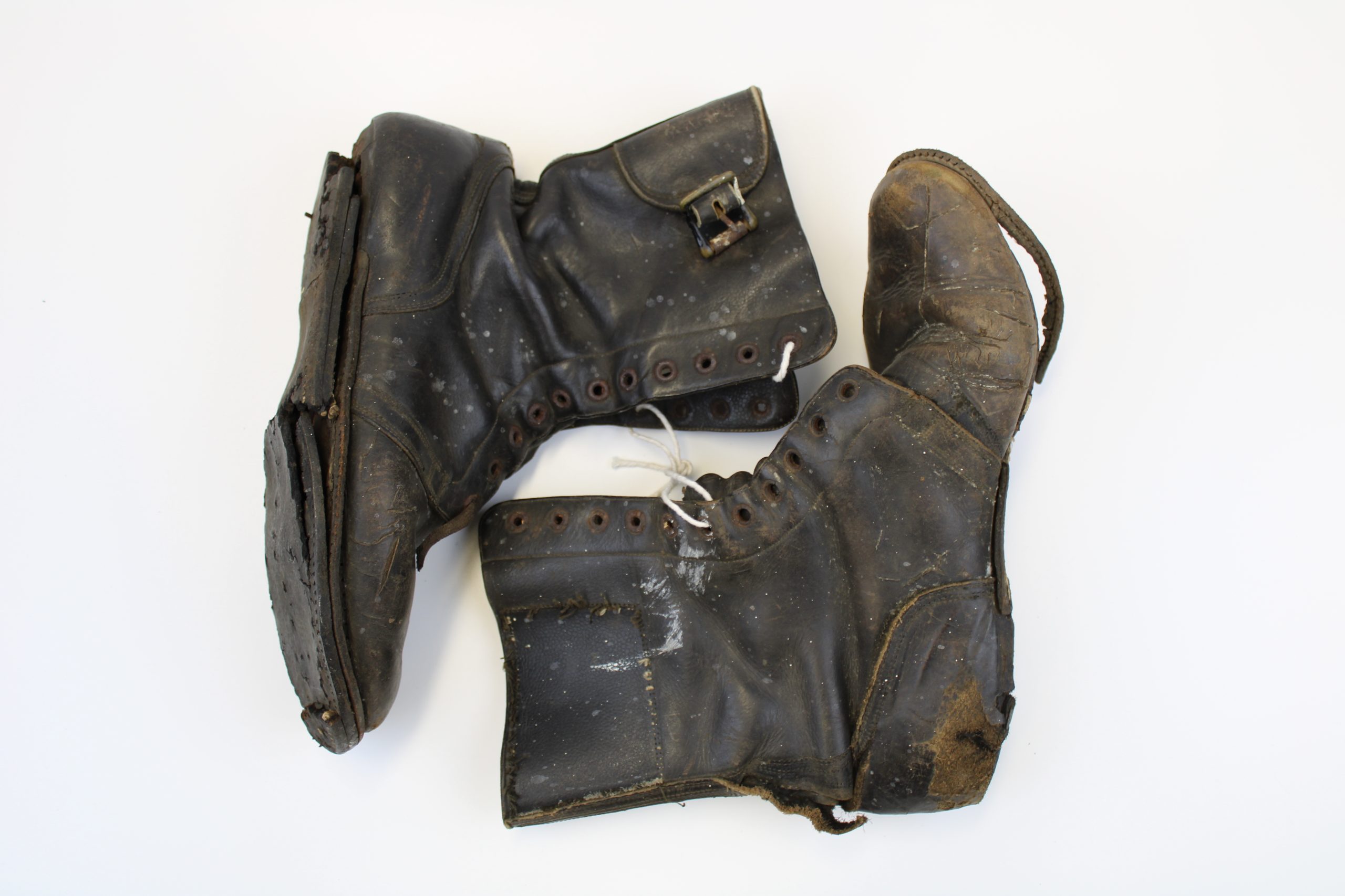 A pair of dark brown leather lace-up combat boots with ankle buckles, dating from the Second World War period. Each boot features 11 eyelets for laces