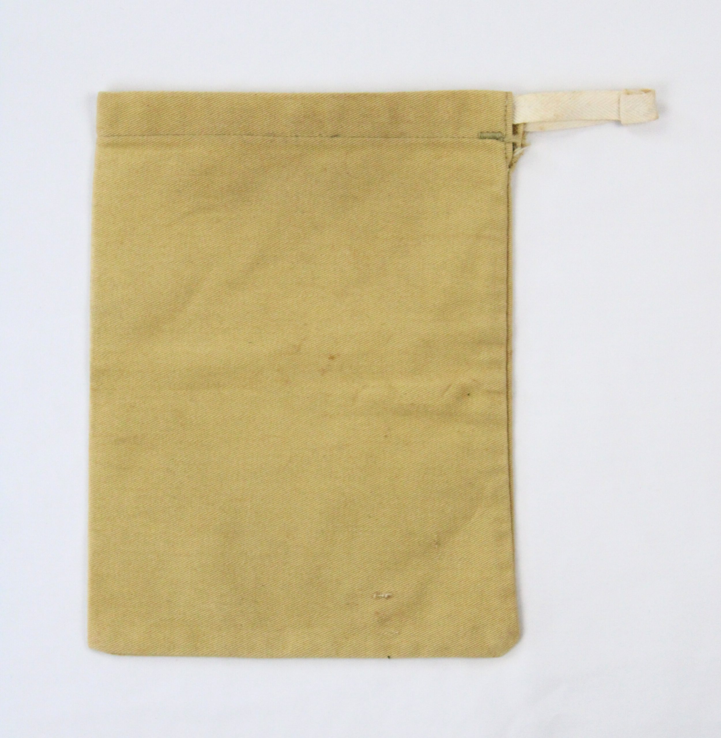Rectangular khaki canvas utility bag with a stitched hem and a fabric tie closure at the top corner. The bag is unlined and shows faint signs of use.