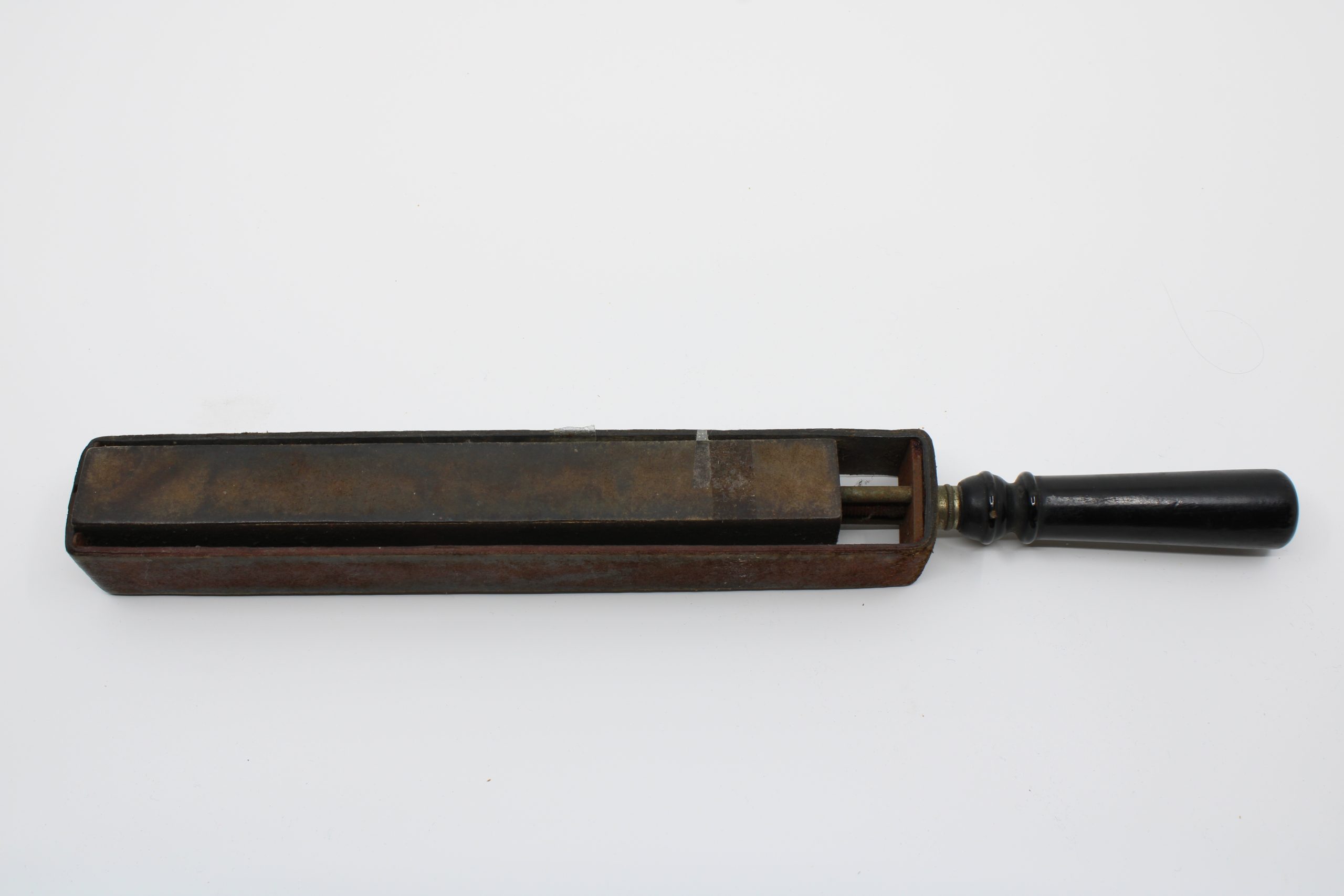 Rectangular leather razor strop mounted on a wooden handle. The strop is double-sided, one surface padded and the other plain, intended for sharpening