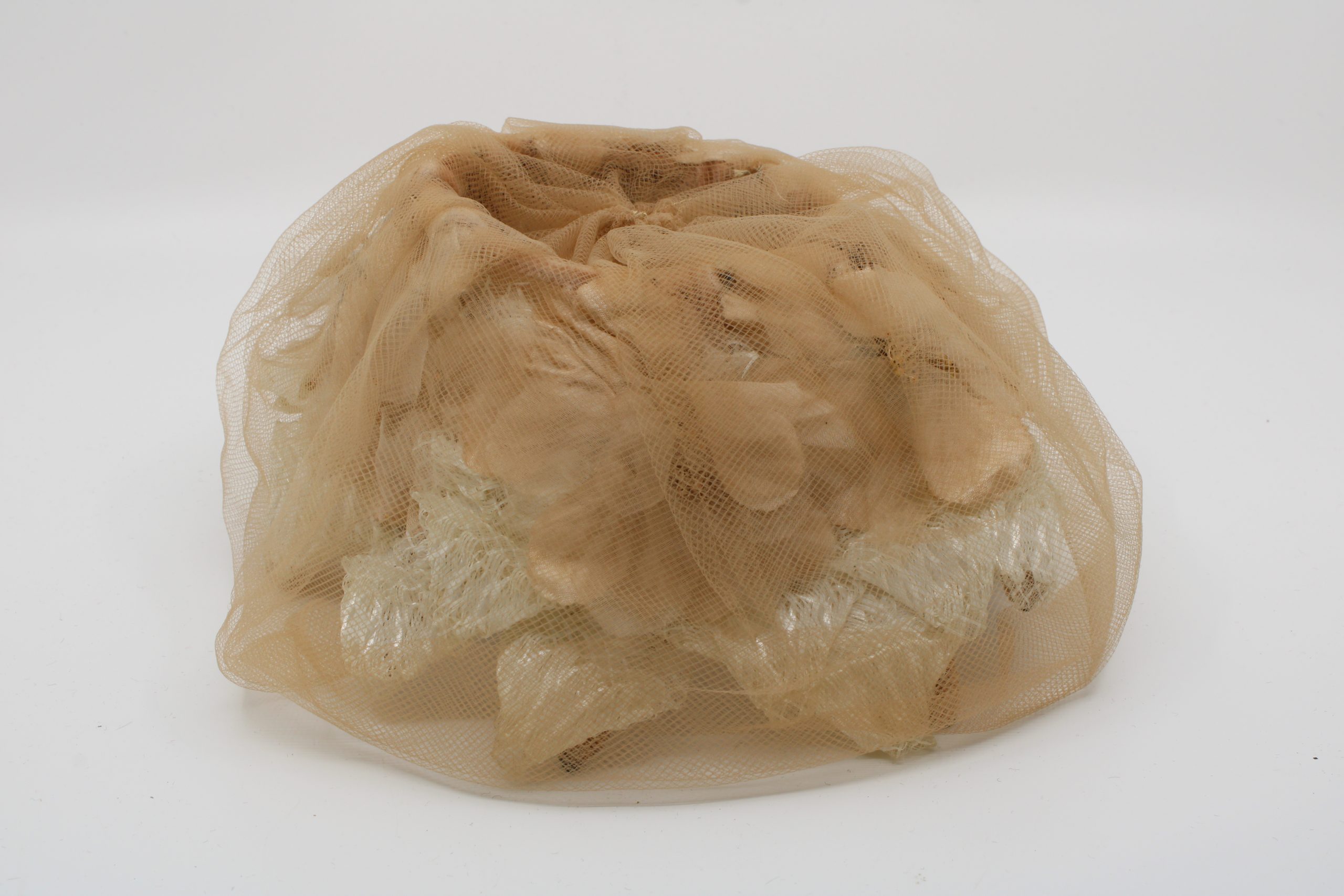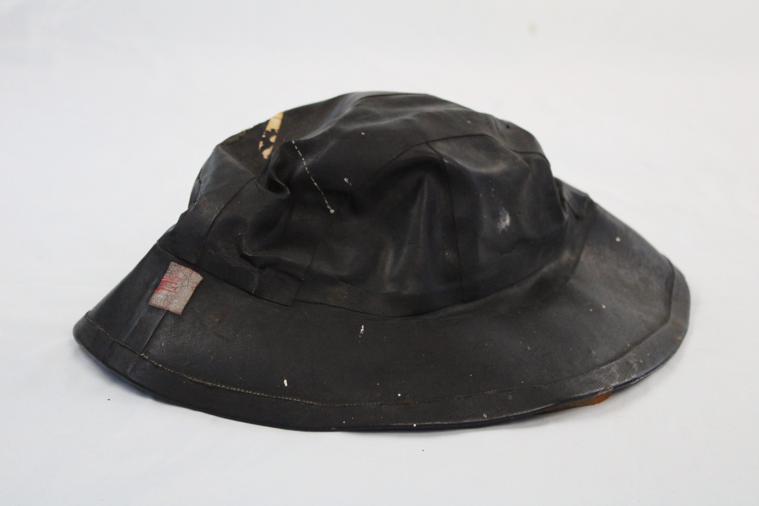 Round rubber hat with ear pieces and tie strings. Rust on the cotton interior. Paint stains on exterior.