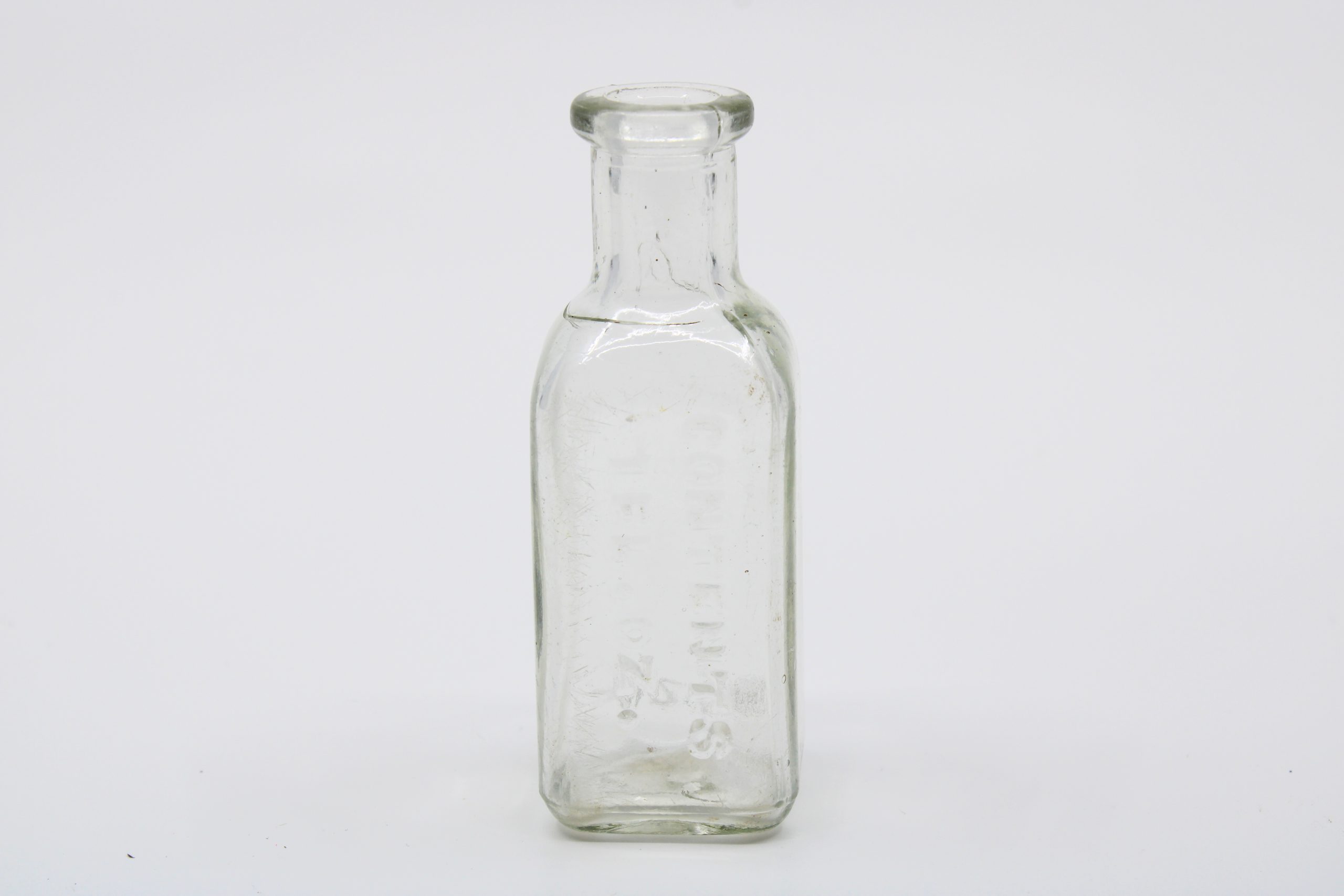 Small, clear glass bottle with a rectangular body, short cylindrical neck, and rounded rim. The bottle is transparent and bears embossed lettering on