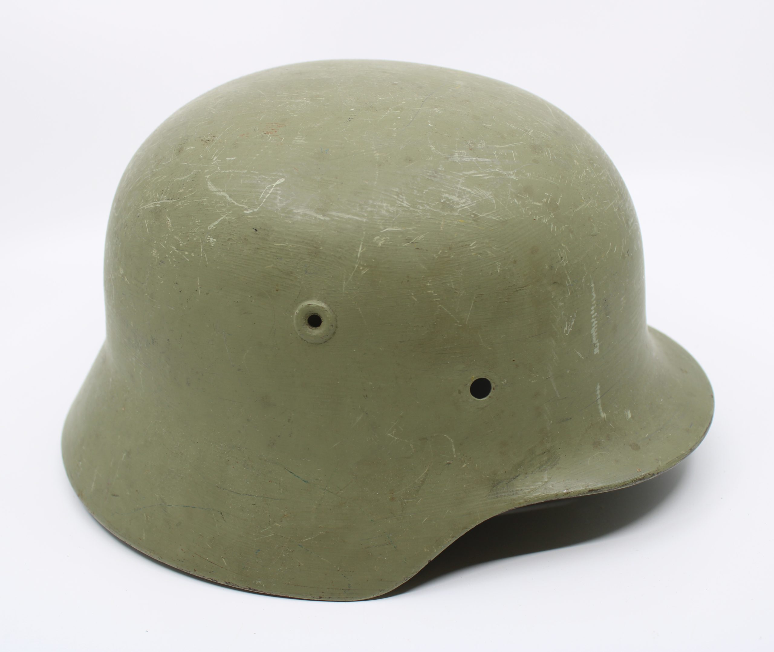 Steel combat helmet, painted in matte olive green, with a distinctive flared rim and sloped sides typical of the German M35 or M40 Stahlhelm design. T