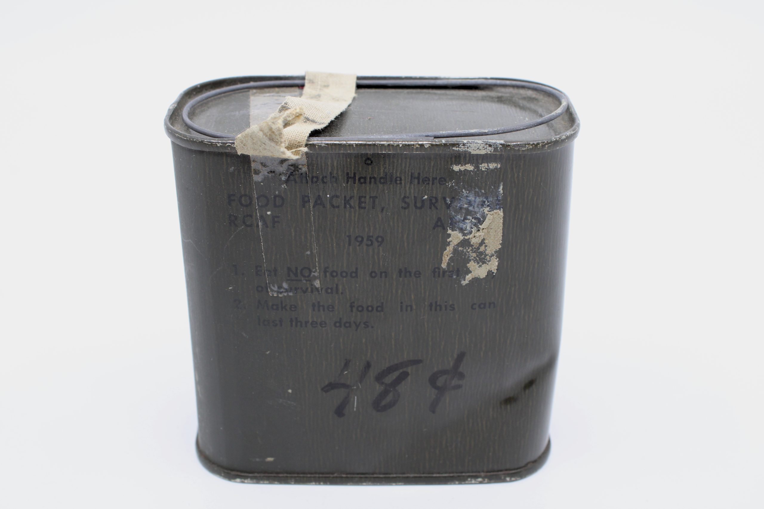 A rectangular black-painted metal can containing a Royal Canadian Air Force survival food packet dated 1959. The can is sealed with a fabric pull tab