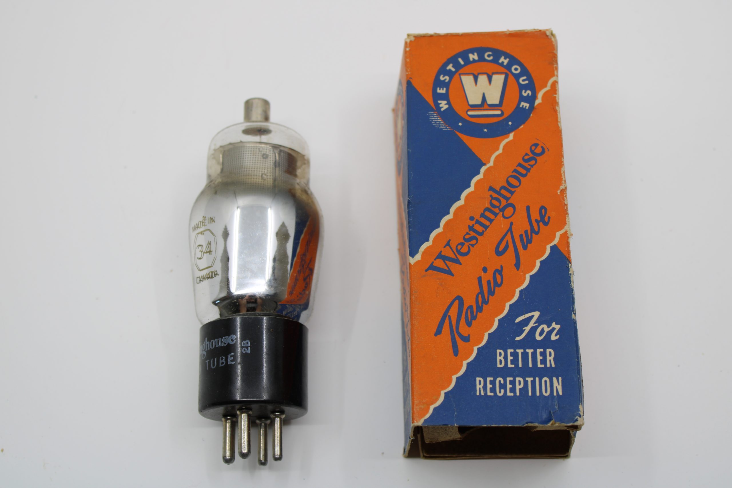 Glass and metal vacuum tube with four metal prongs at the base, housed in its original orange and blue cardboard box. The front of the box reads “We