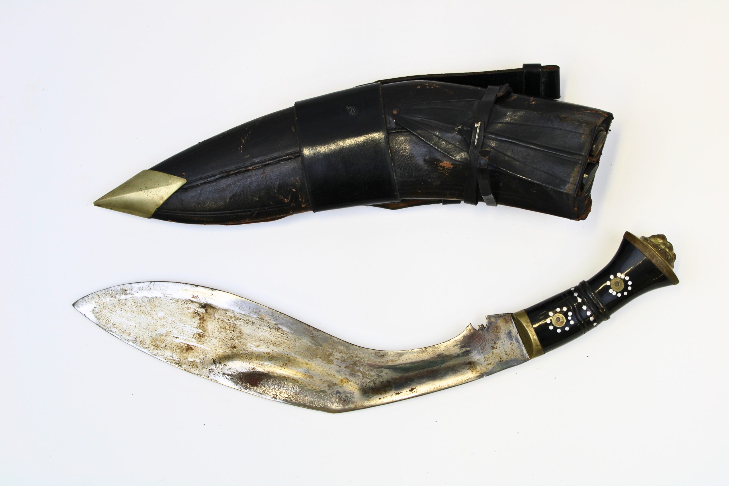 A traditional Nepalese kukri knife with its accompanying black leather scabbard. The curved steel blade has a distinctive inward sweep and a notched b