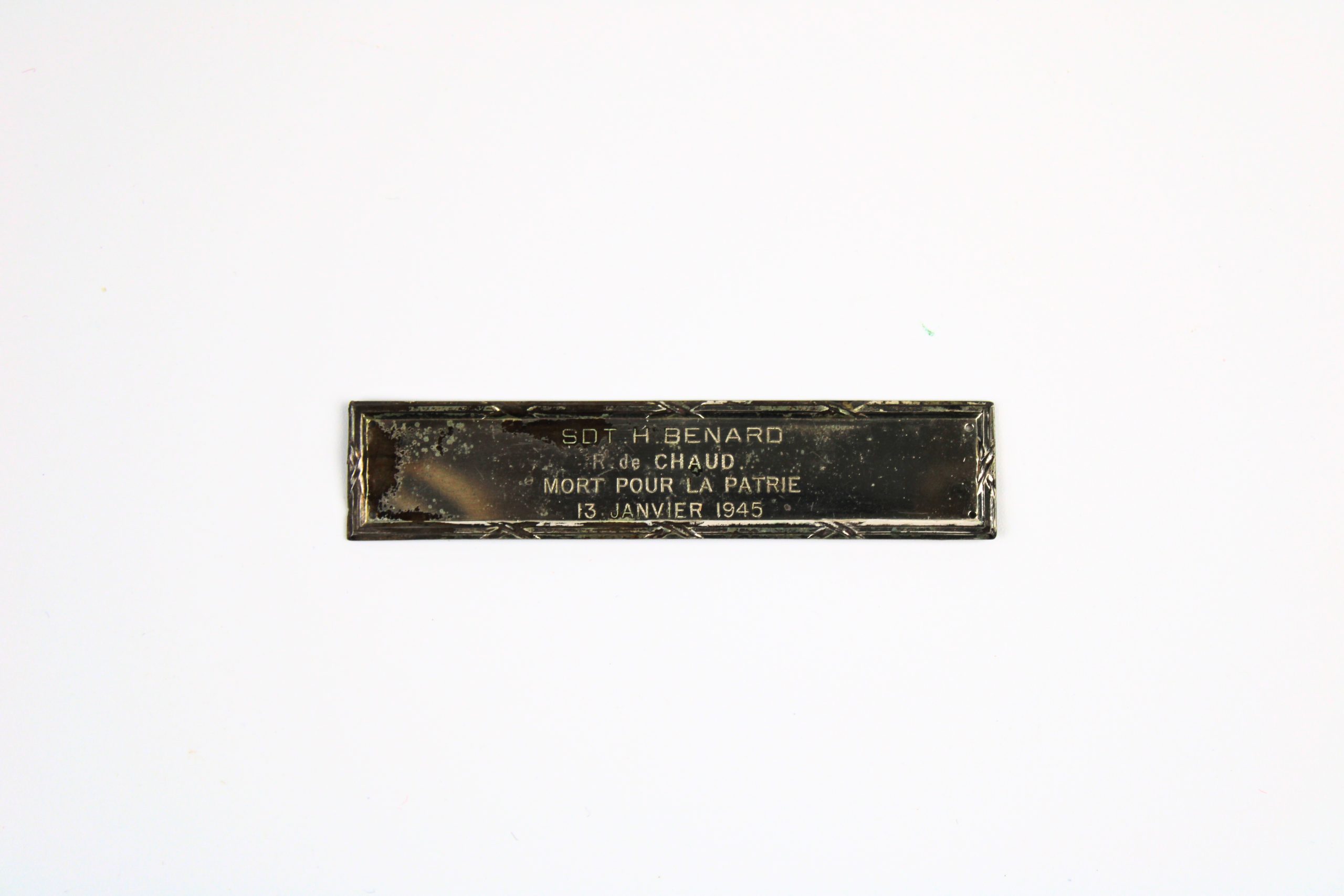Rectangular engraved metal plaque bearing an inscription commemorating Private Hubert Bénard of Le Régiment de la Chaudière. The tag reads “Mort