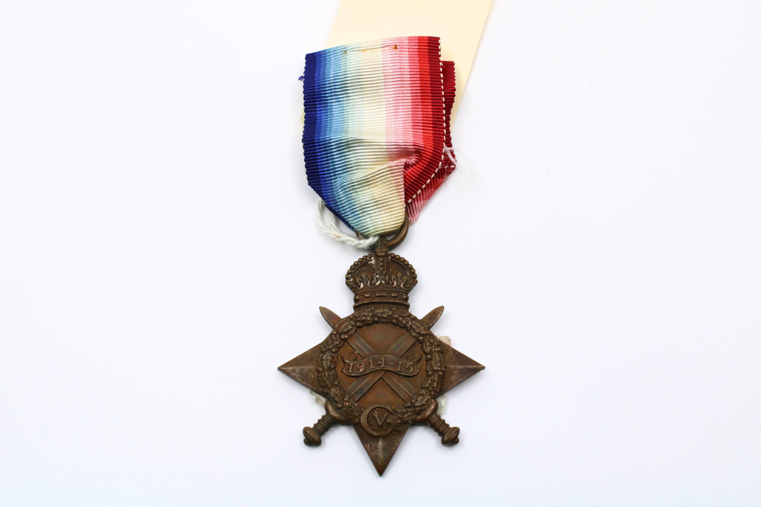 Bronze four-pointed star-shaped campaign medal surmounted by a crown, with two crossed swords and a central scroll inscribed 1914–15. The medal is s