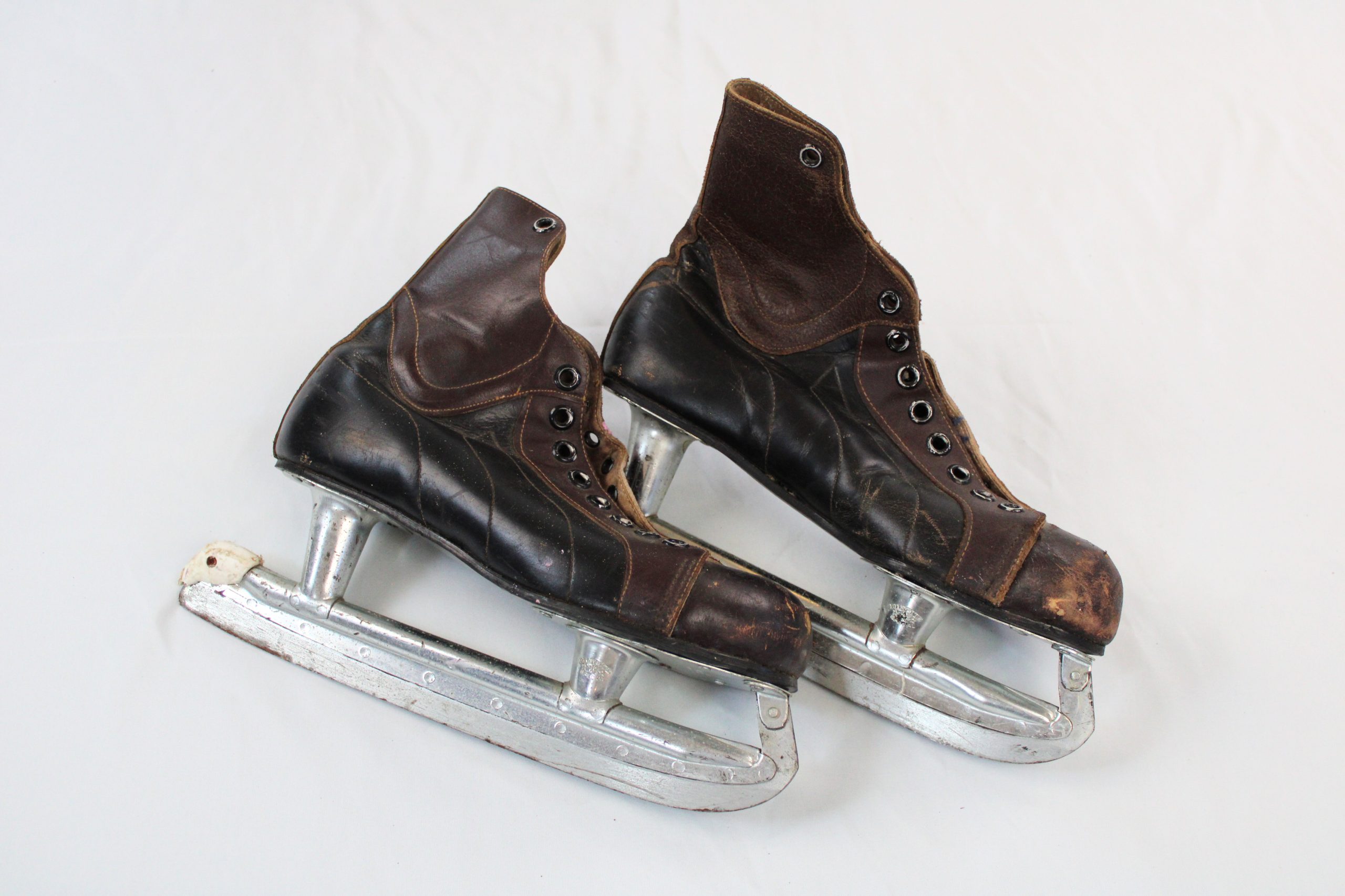 A pair of vintage men’s ice skates made of black and brown leather boots attached to metal skate blades. The boots are stitched and reinforced aroun