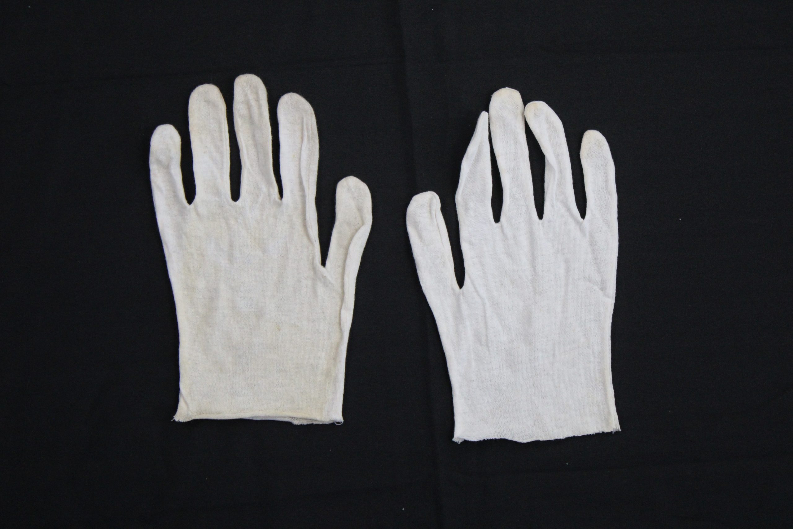Pair of thin, white cotton gloves constructed from lightweight machine-knit fabric. Each glove features four fingers and one thumb with simple stitche