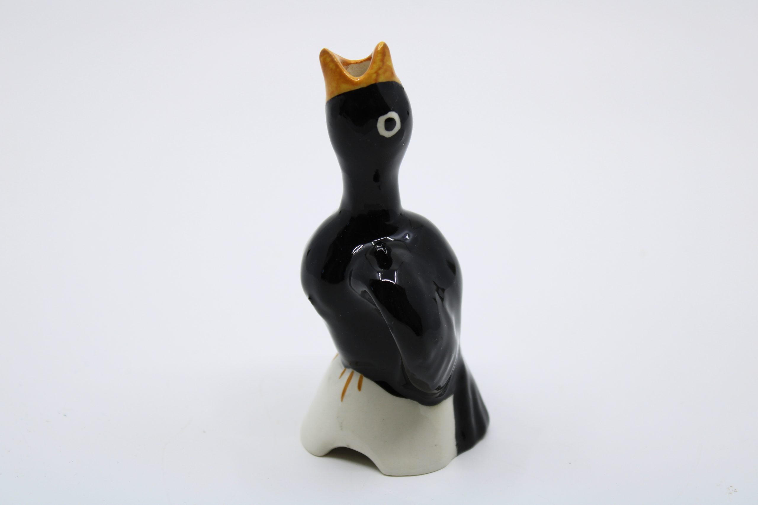 Glazed ceramic pie bird, shaped like a stylized blackbird perched on a white base. The bird’s body is glossy black, with a yellow crown-like beak an