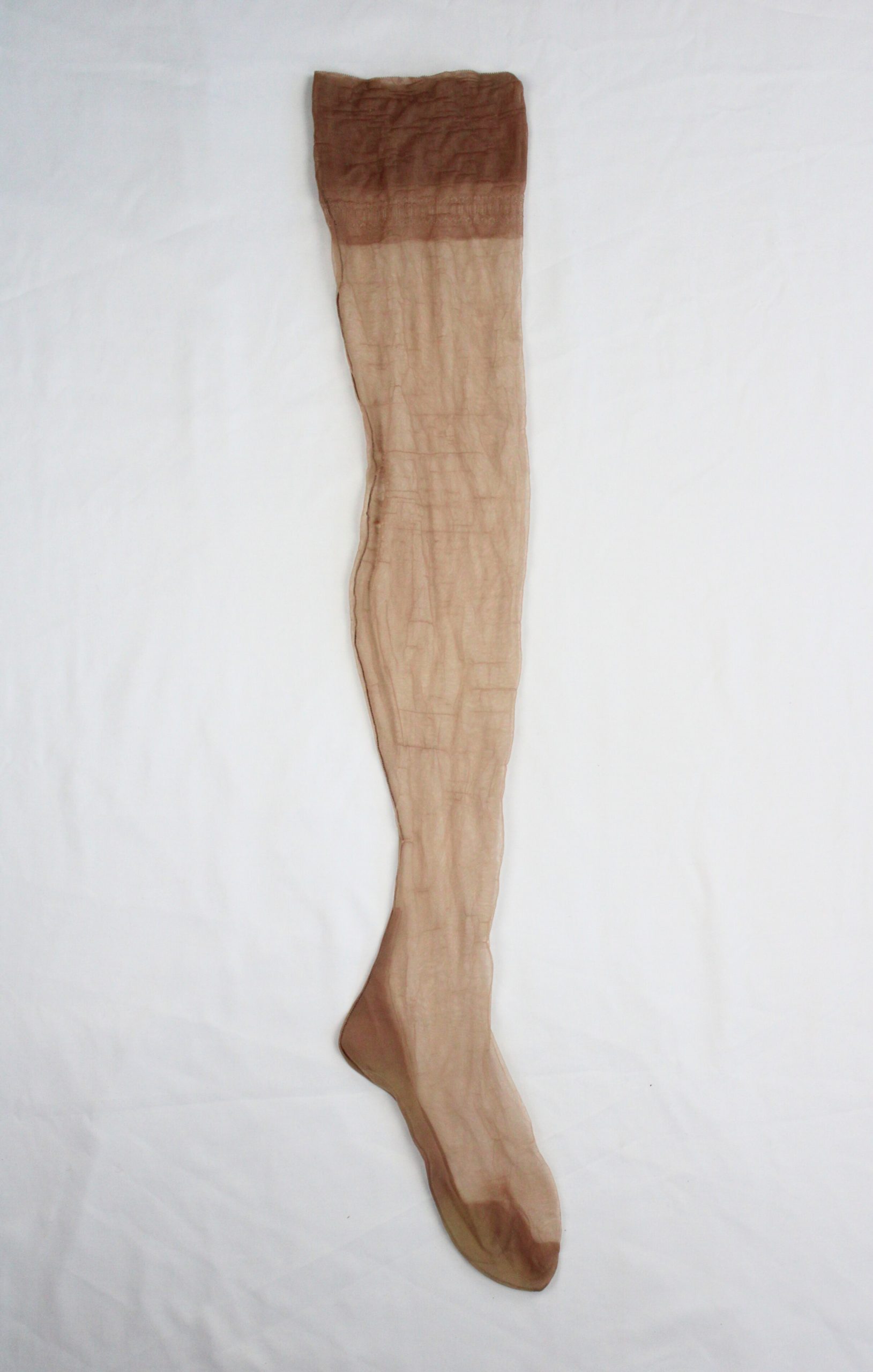 Single sheer, flesh-toned nylon stockings, reaching above the knee. The stockings have a slightly darker reinforced toe and welt (top band), character