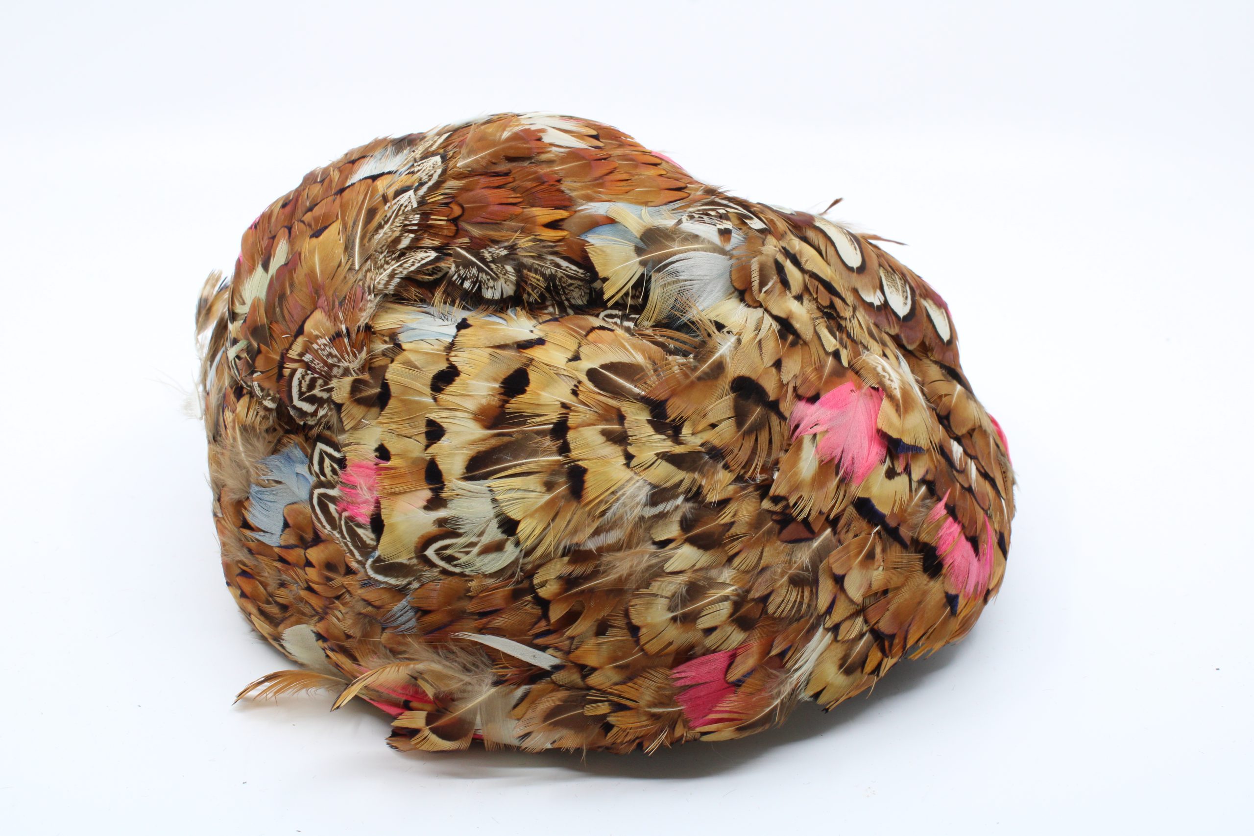 -The hat’s surface is composed of overlapping pheasant-like feather