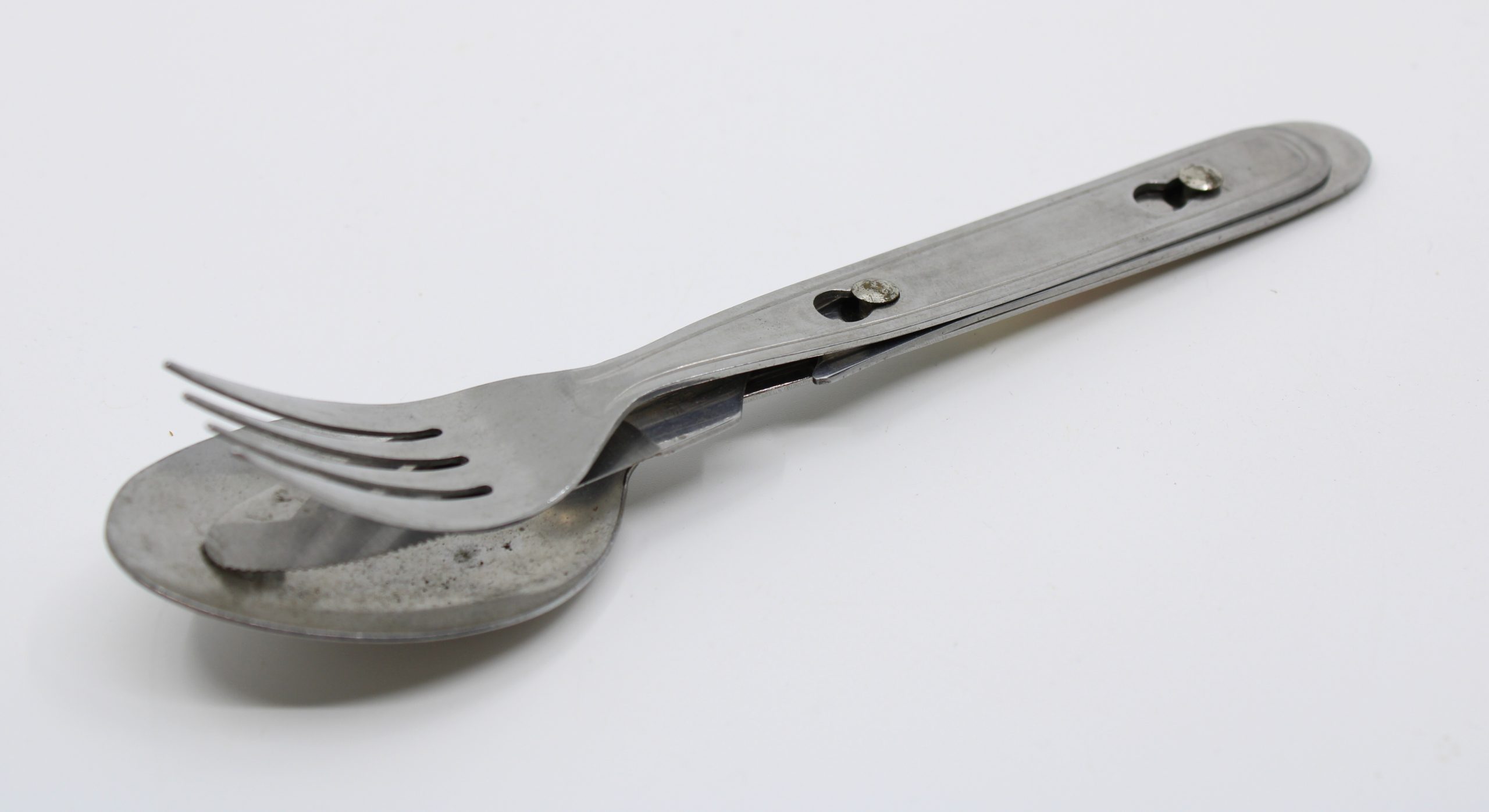 A stainless steel knife, fork, and spoon set designed to interlock by means of slide pins through the handles. The knife includes an integrated bottle