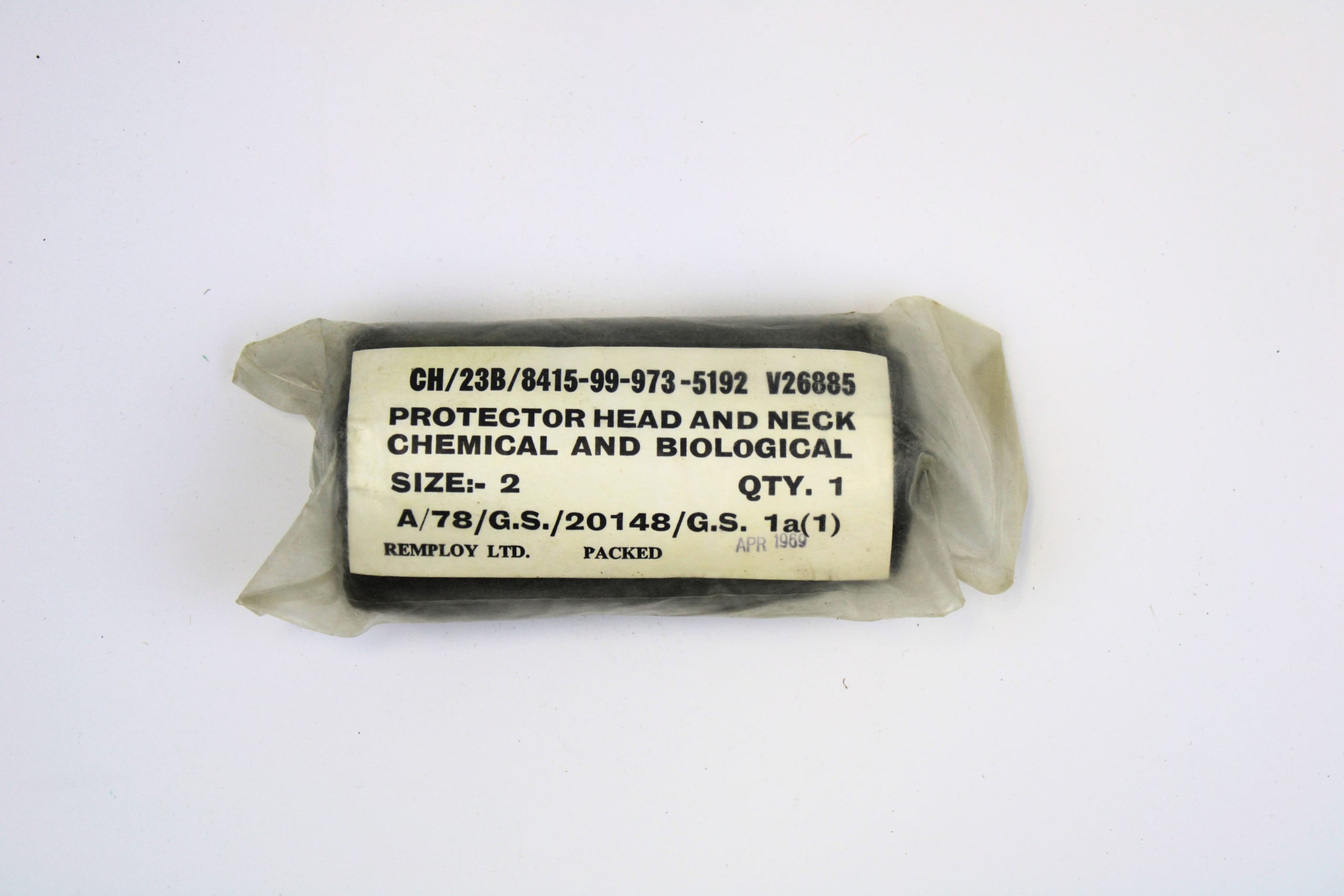 A sealed head and neck protector designed for chemical and biological defense, size 2, produced by Remploy Ltd. The item is contained in its original
