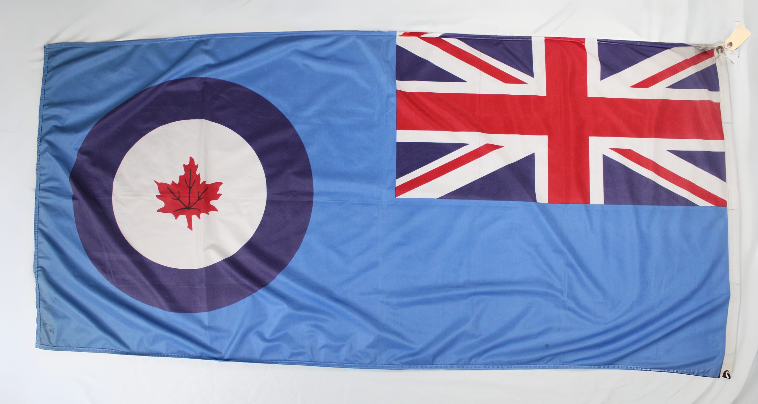 Royal Canadian Air Force flag featuring a light blue field with the Union Jack in the canton (upper left corner) and the modern R.C.A.F. roundel—a r