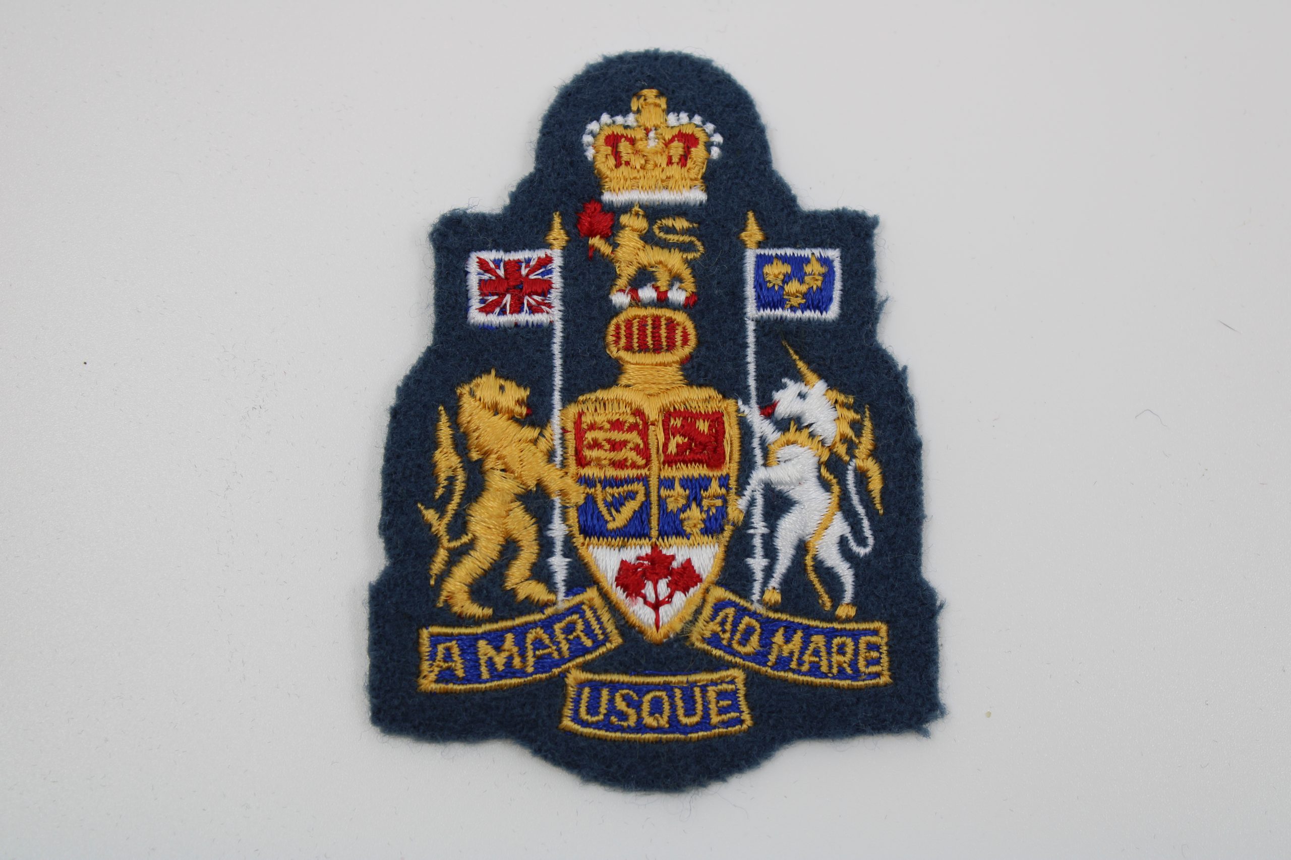 An embroidered Canadian Armed Forces Chief Warrant Officer (CWO) rank badge featuring the Canadian Coat of Arms in full colour on a navy felt backgrou