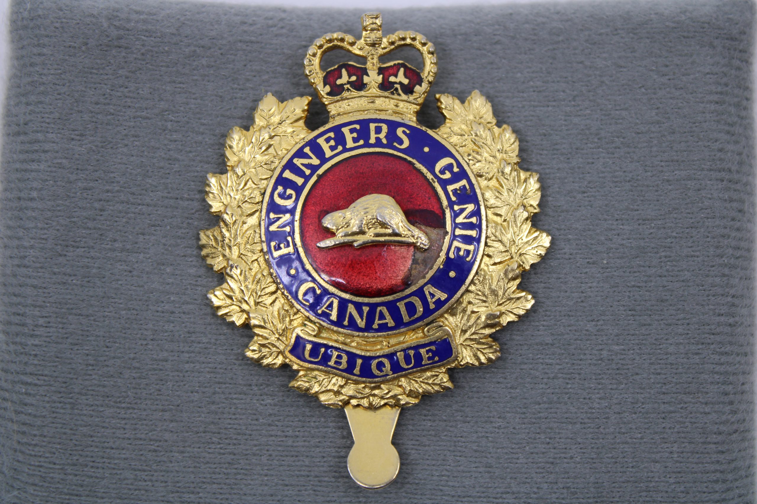 Gold and enamel metal cap badge featuring a beaver on a red enamel field, encircled by a blue band bearing bilingual inscriptions. The badge is surrou