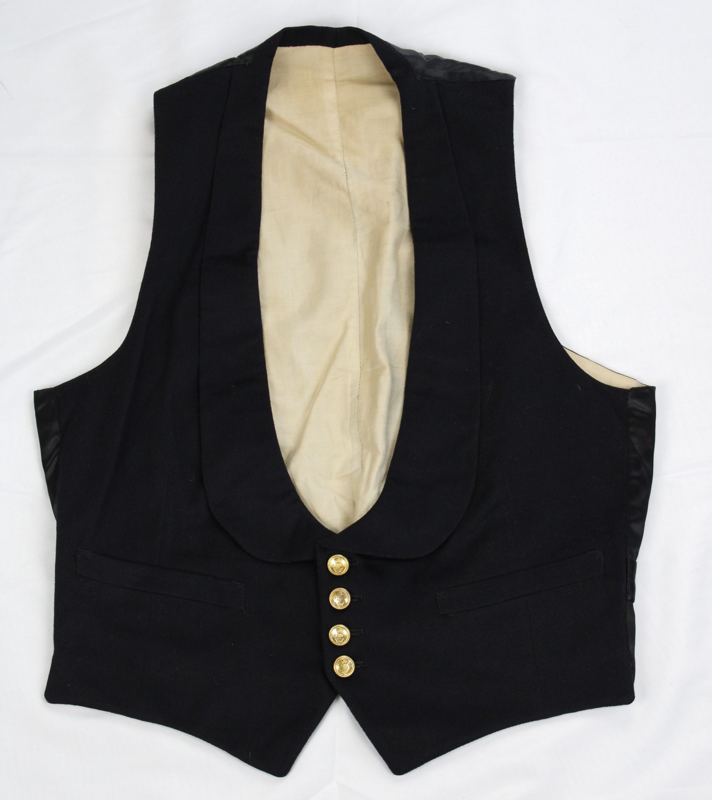 Black formal waistcoat featuring four gold-tone metal buttons embossed with insignia motifs near the lower front. The front is tailored in black wool,