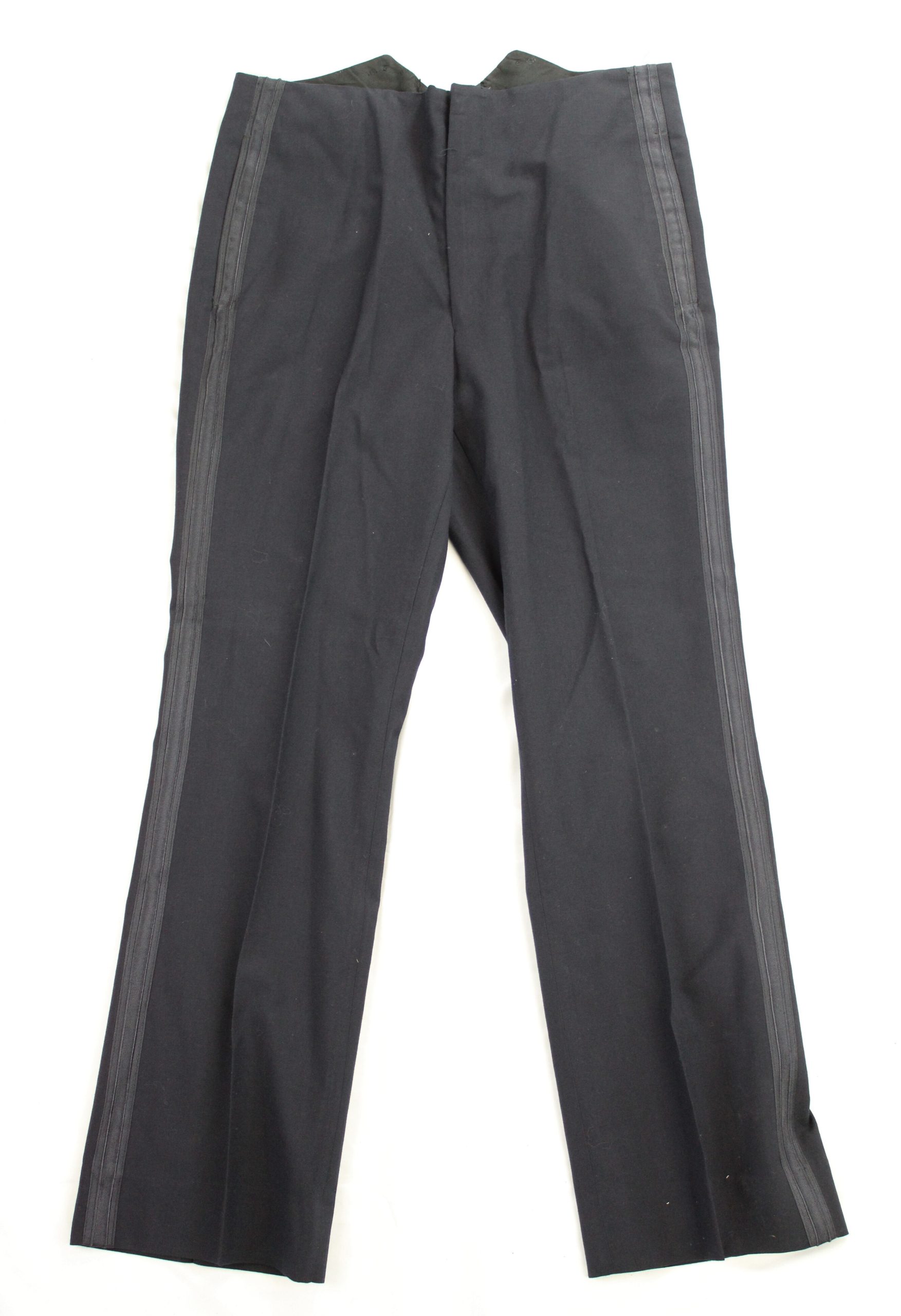 Pair of dark navy wool trousers belonging to a naval officer’s mess dress uniform. The trousers are tailored with a high waist and flat front, and f