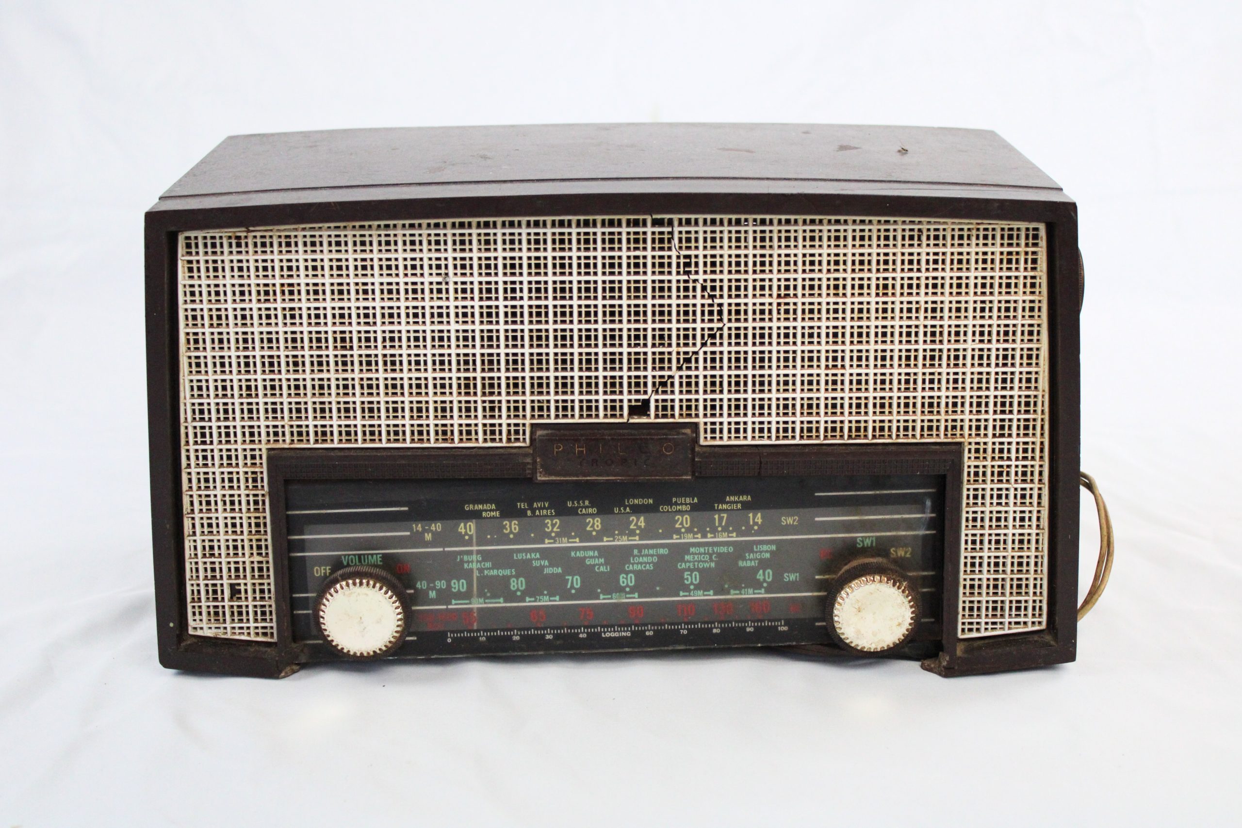 A brown rectangular tabletop radio with a cream-colored woven front speaker grille and two large circular control knobs on the lower front panel.