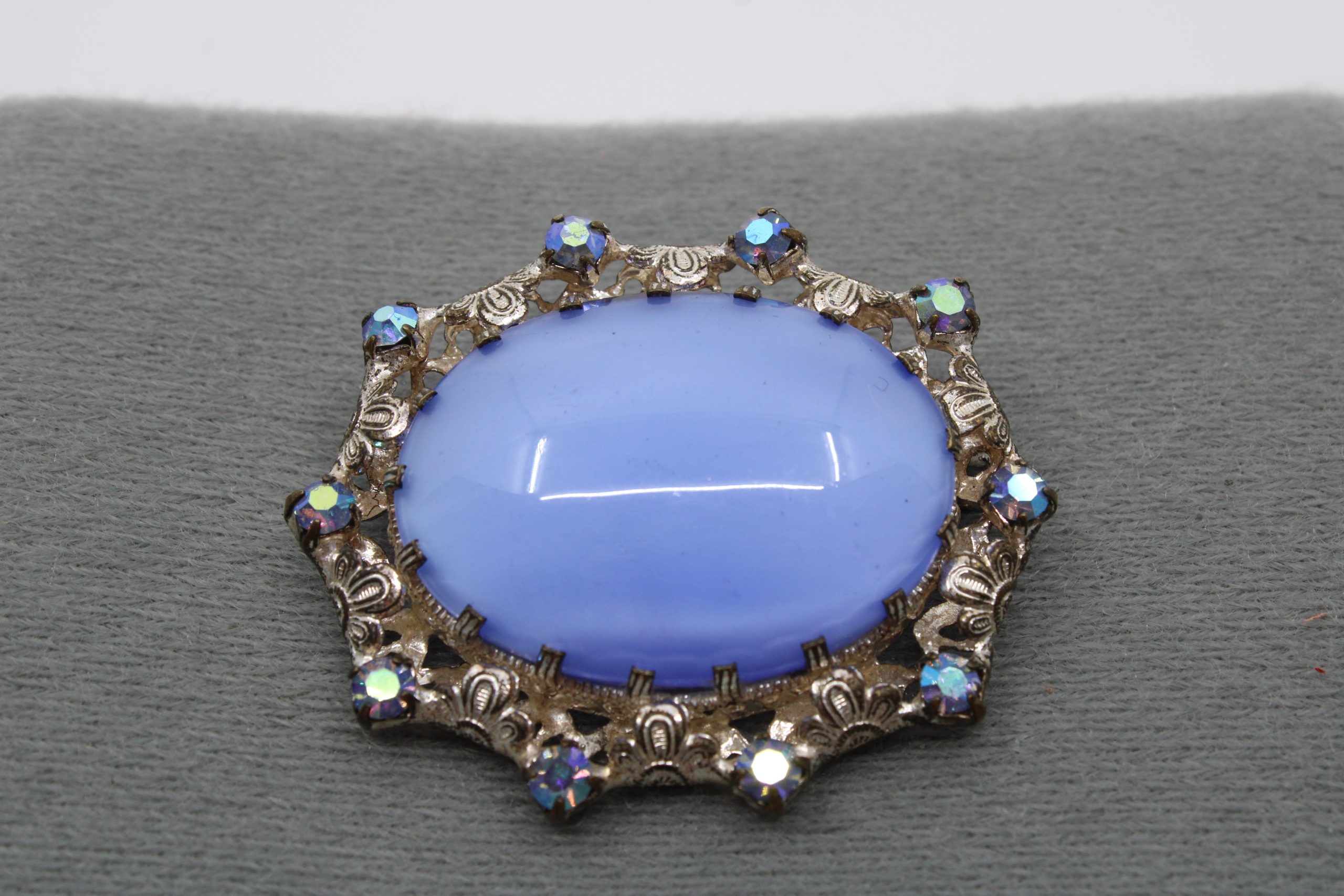 An ornate vintage brooch featuring a large oval blue cabochon stone set in an intricately detailed silver-tone metal frame. The border is decorated wi