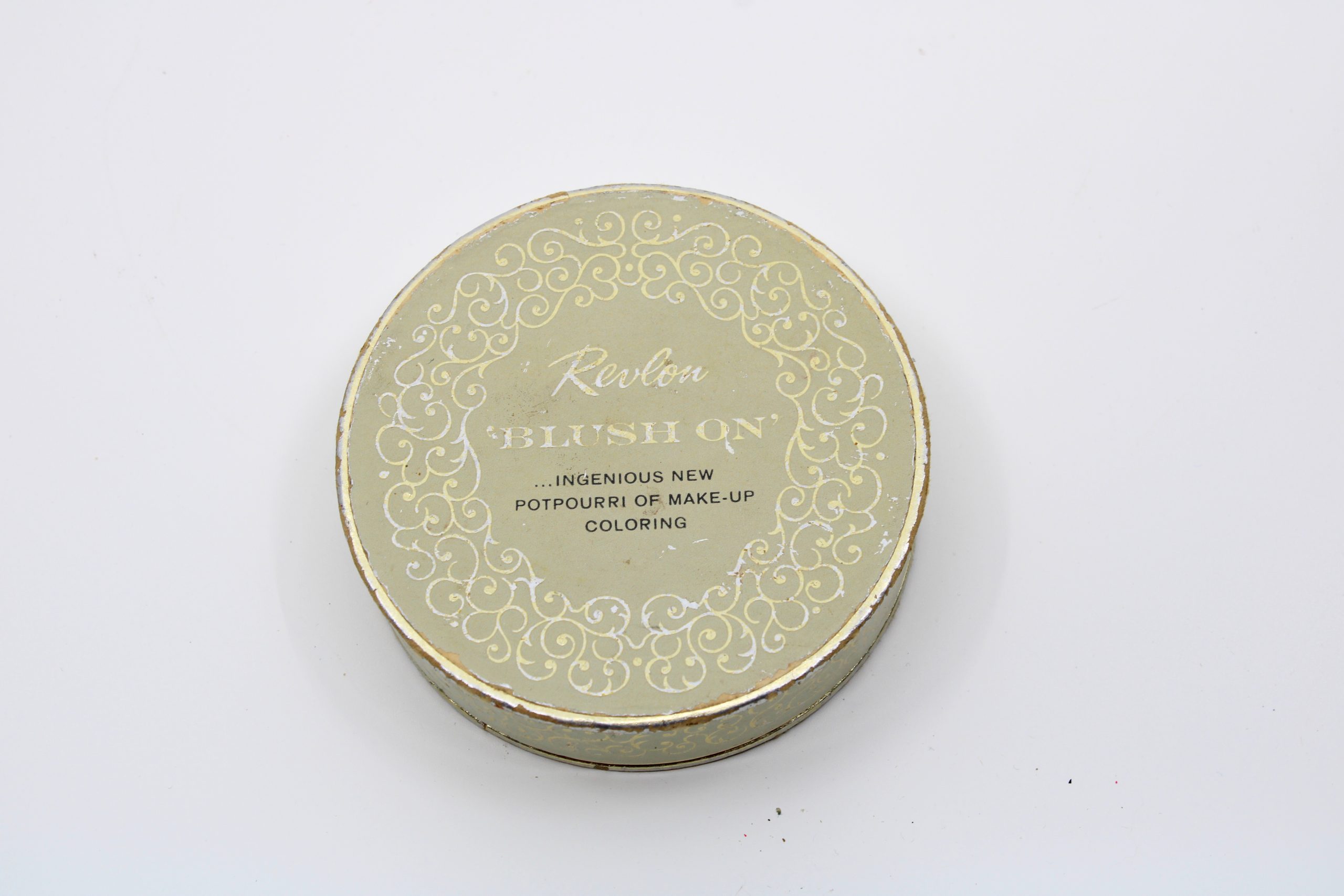 A round metal powder compact with removable lid, containing pressed peach-colored rouge (“Tawny Peach”) and a soft application puff. The tin is go