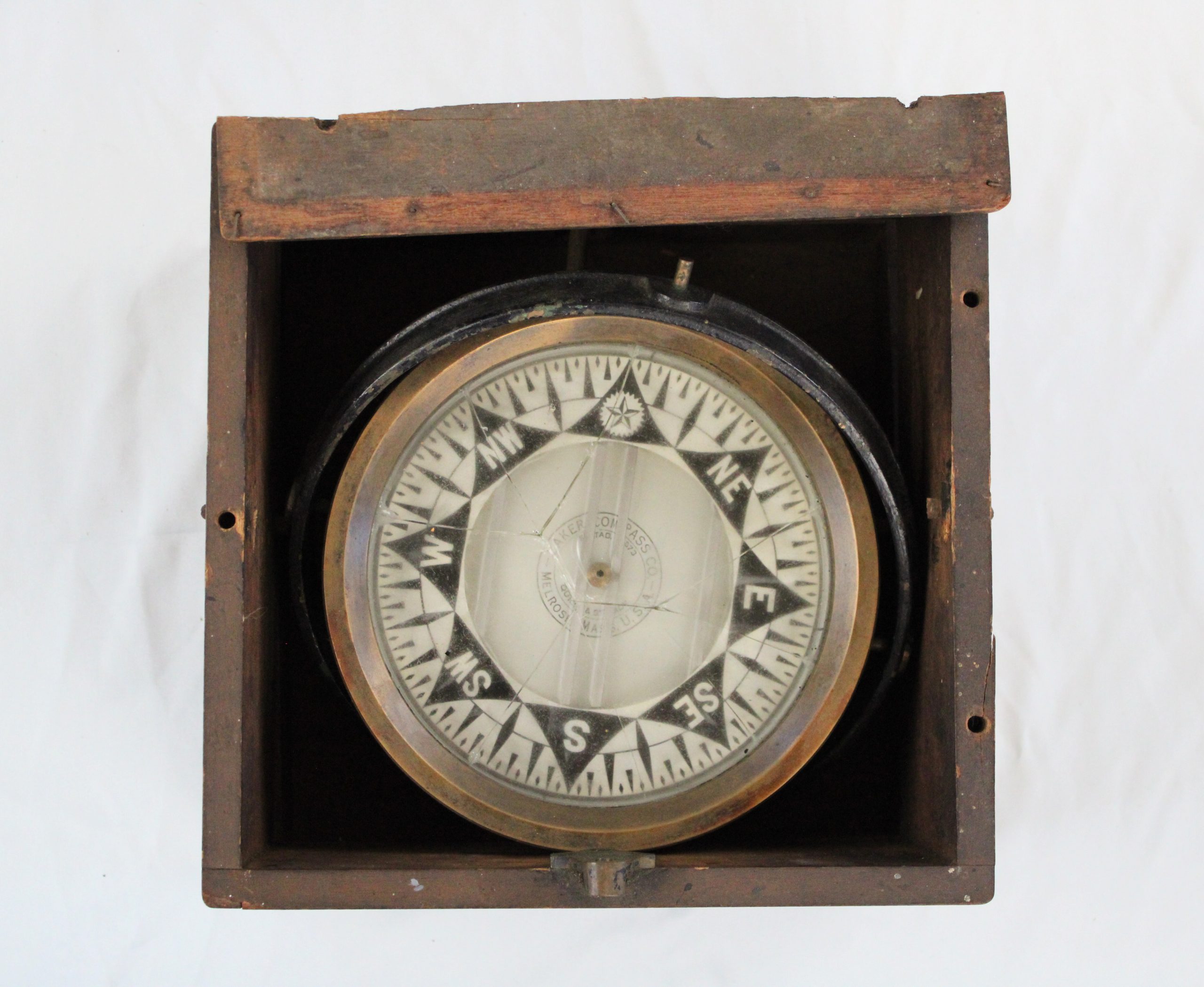 Large mariner’s compass housed in a square wooden box with dovetail joints and a hinged lid.